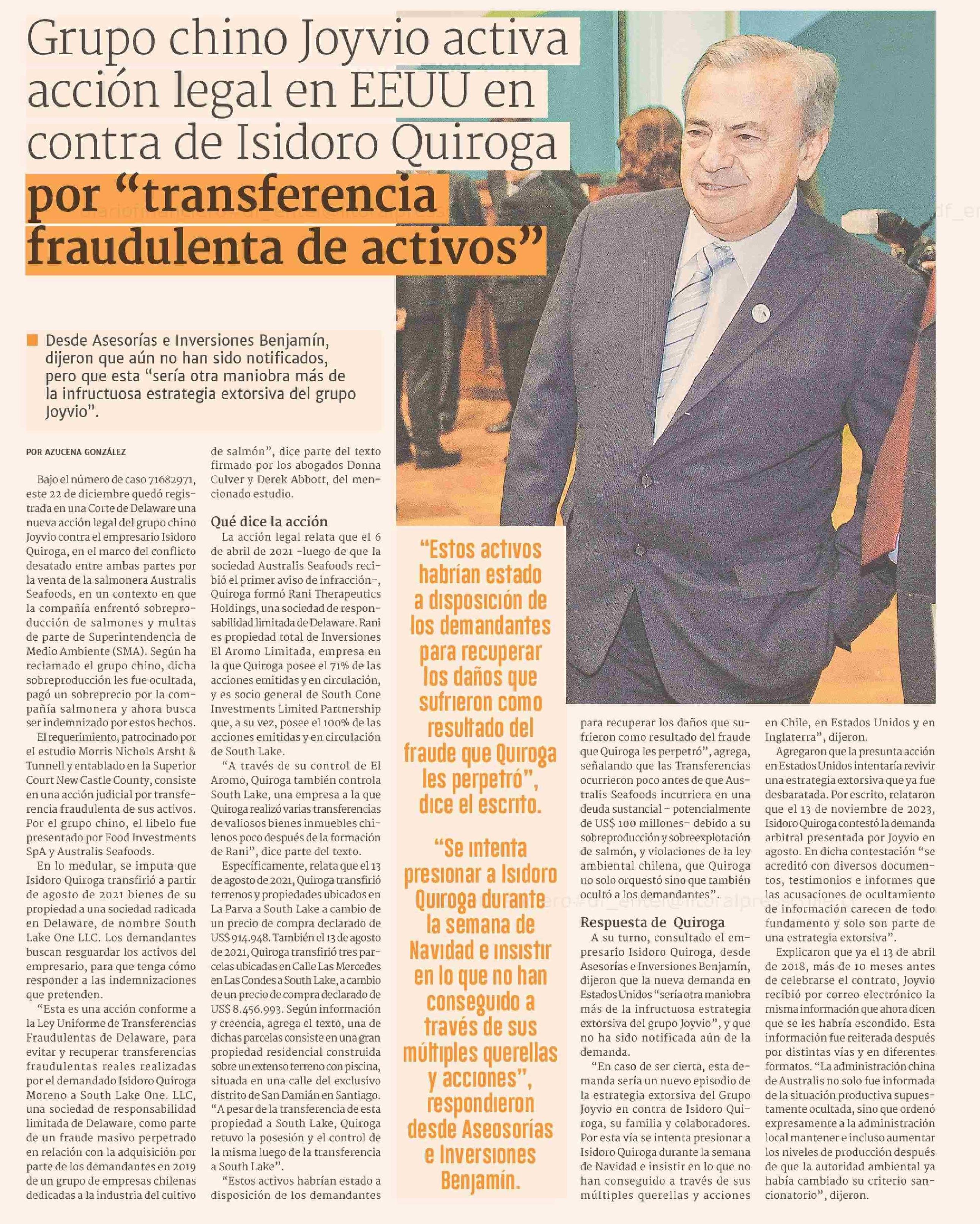 Grupo chino Joyvio activa acción legal en EEUU en contra de Isidoro Quiroga por “transferencia fraudulenta de activos” 27-12-2023 Diario Financiero |