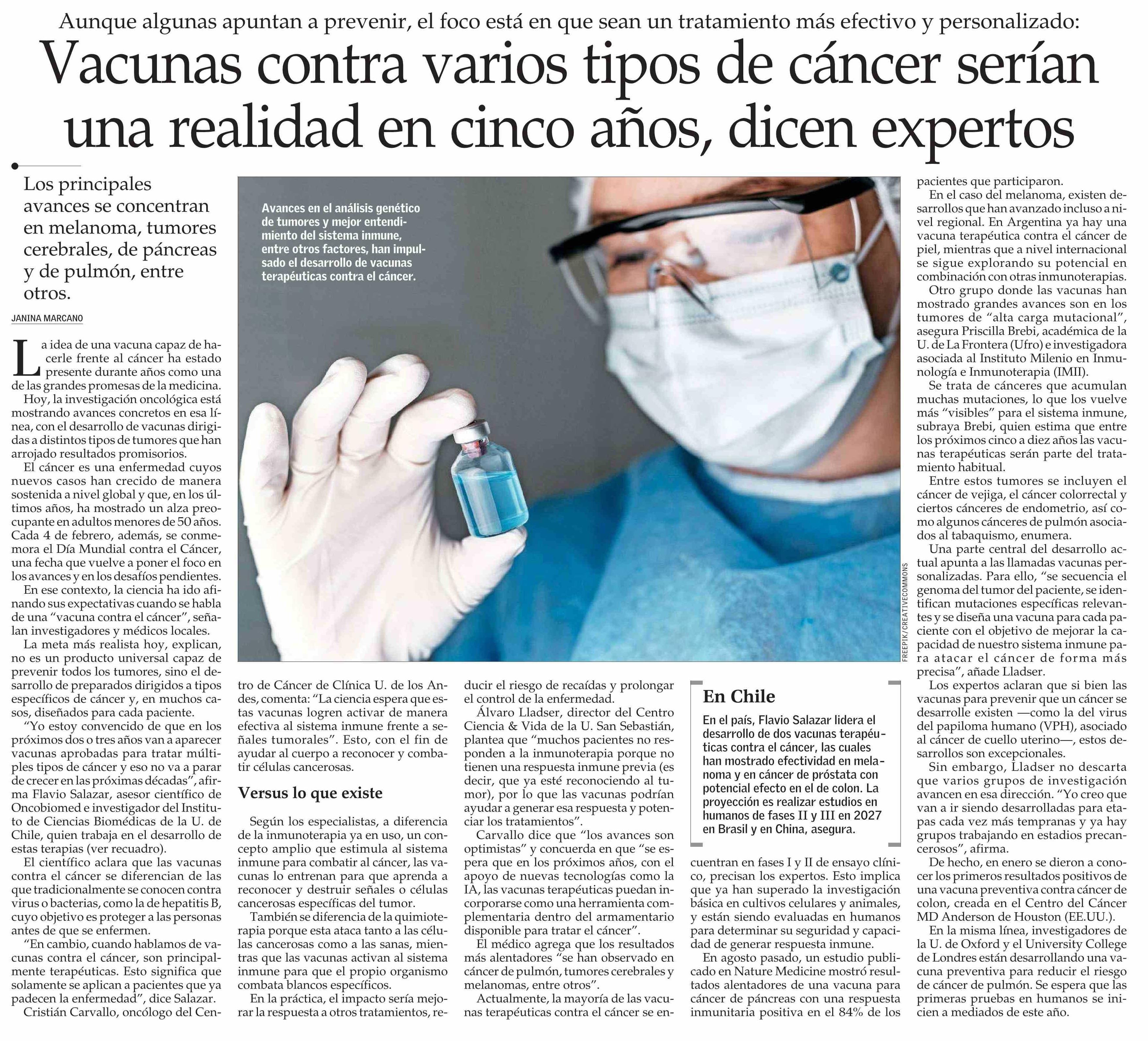 Vacunas contra varios tipos de cáncer serían una realidad en cinco años, dicen expertos 04-02-2026 El Mercurio |