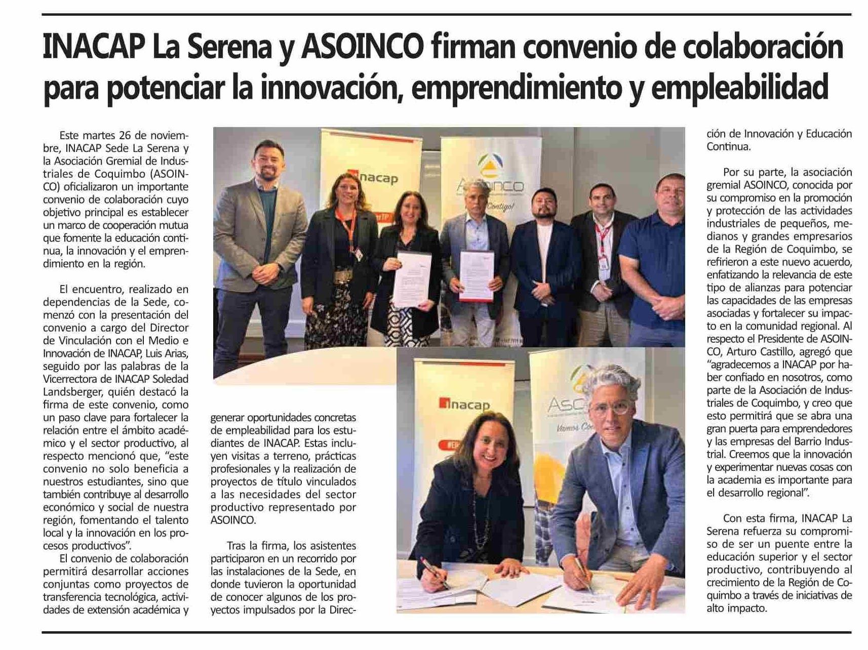 | Título: | INACAP La Serena y ASOINCO firman convenio de colaboración para potenciar la innovación, emprendimiento y empleabilidad |