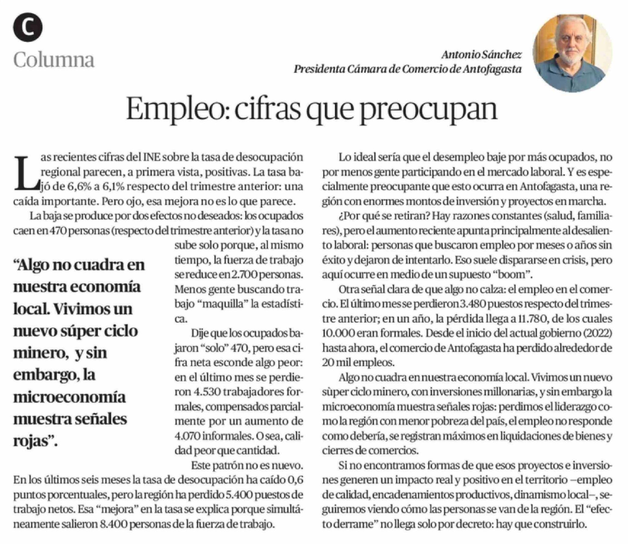 Columnas de Opinión: Empleo: cifras que preocupan 09-02-2026 El Mercurio de Antofagasta |