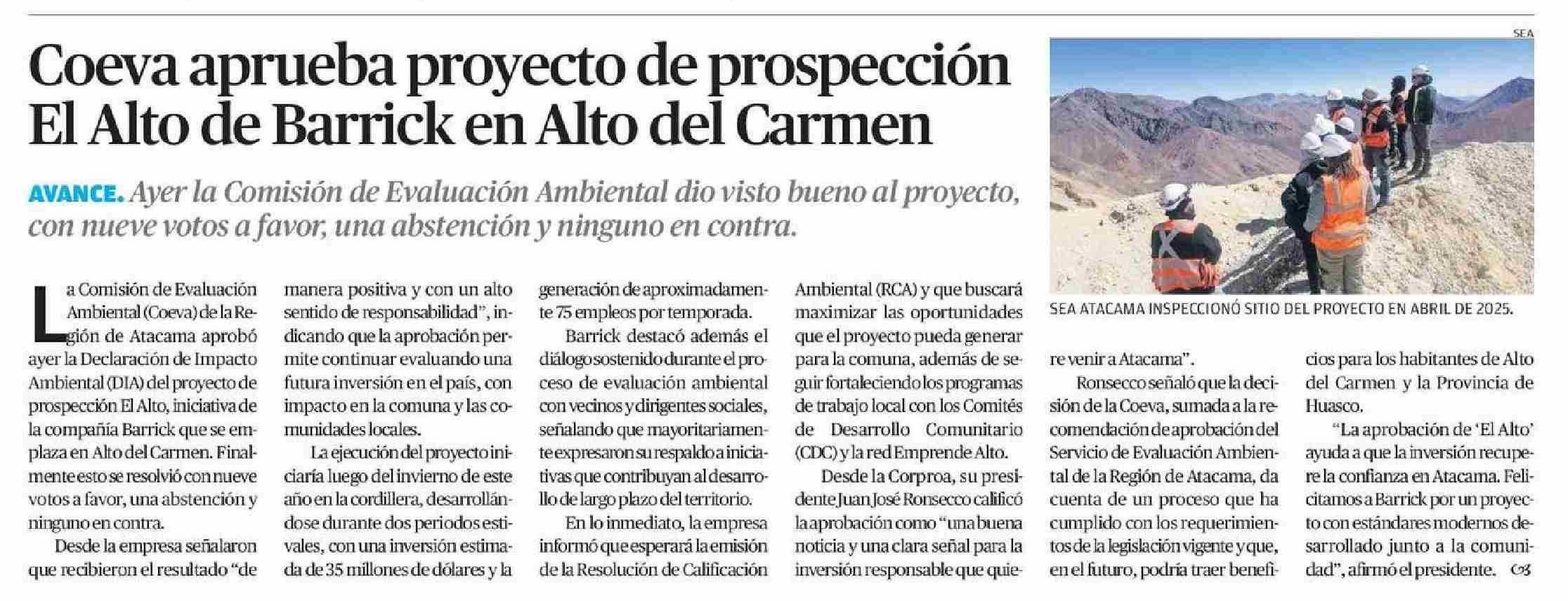 Coeva aprueba proyecto de prospección El Alto de Barrick en Alto del Carmen 20-01-2026 El Diario de Atacama |
