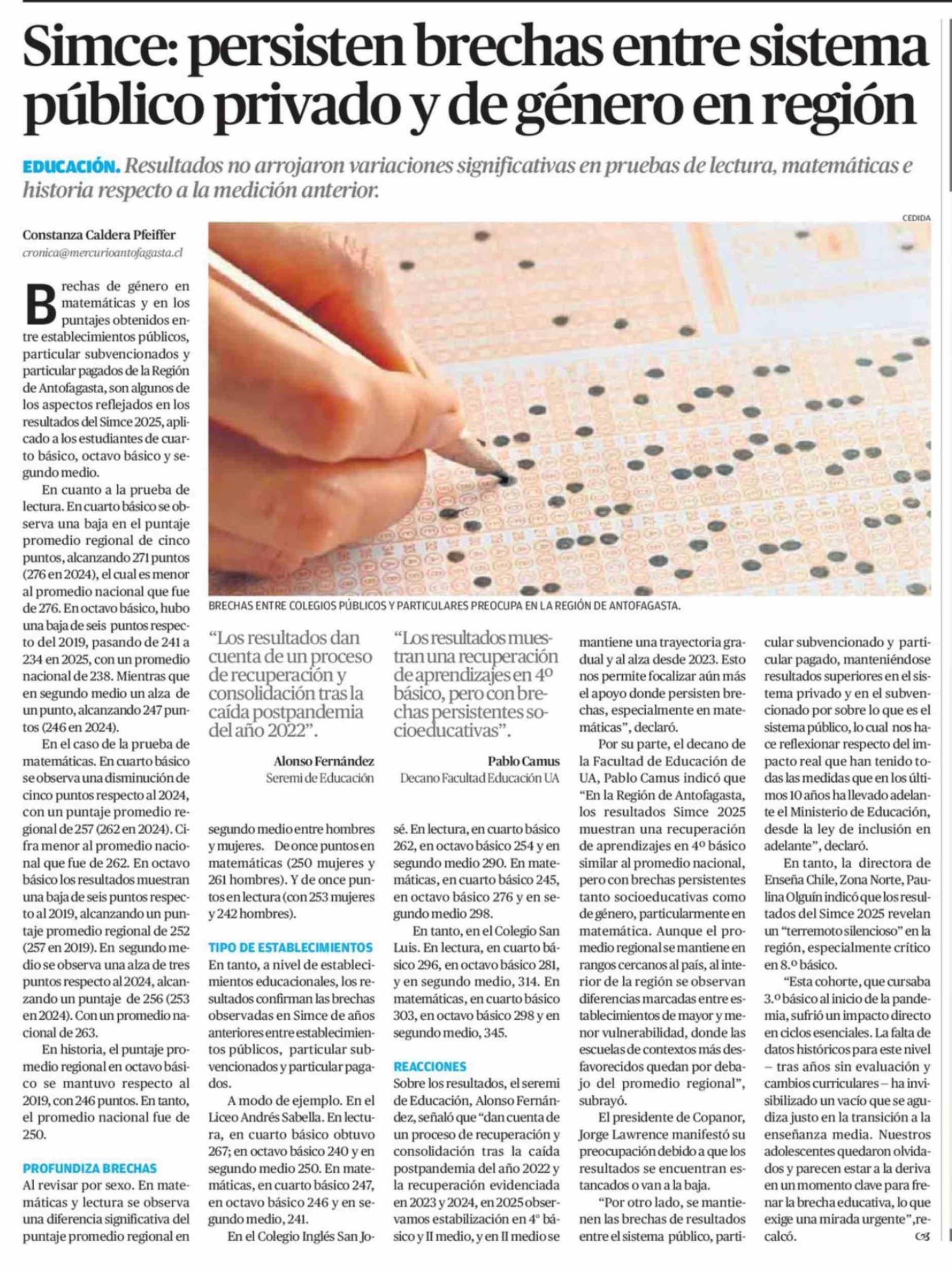 Simce: persisten brechas entre sistema público privado y de género en región 07-03-2026 El Mercurio de Calama |