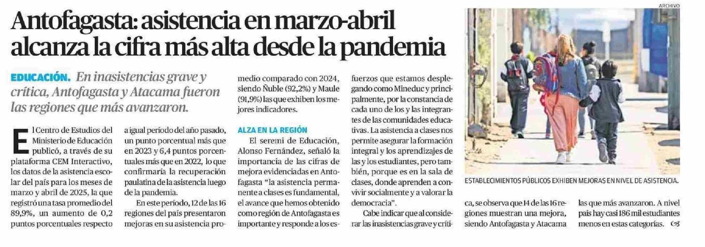 Antofagasta: asistencia en marzo-abril alcanza la cifra más alta desde la pandemia 08-06-2025 El Mercurio de Calama |