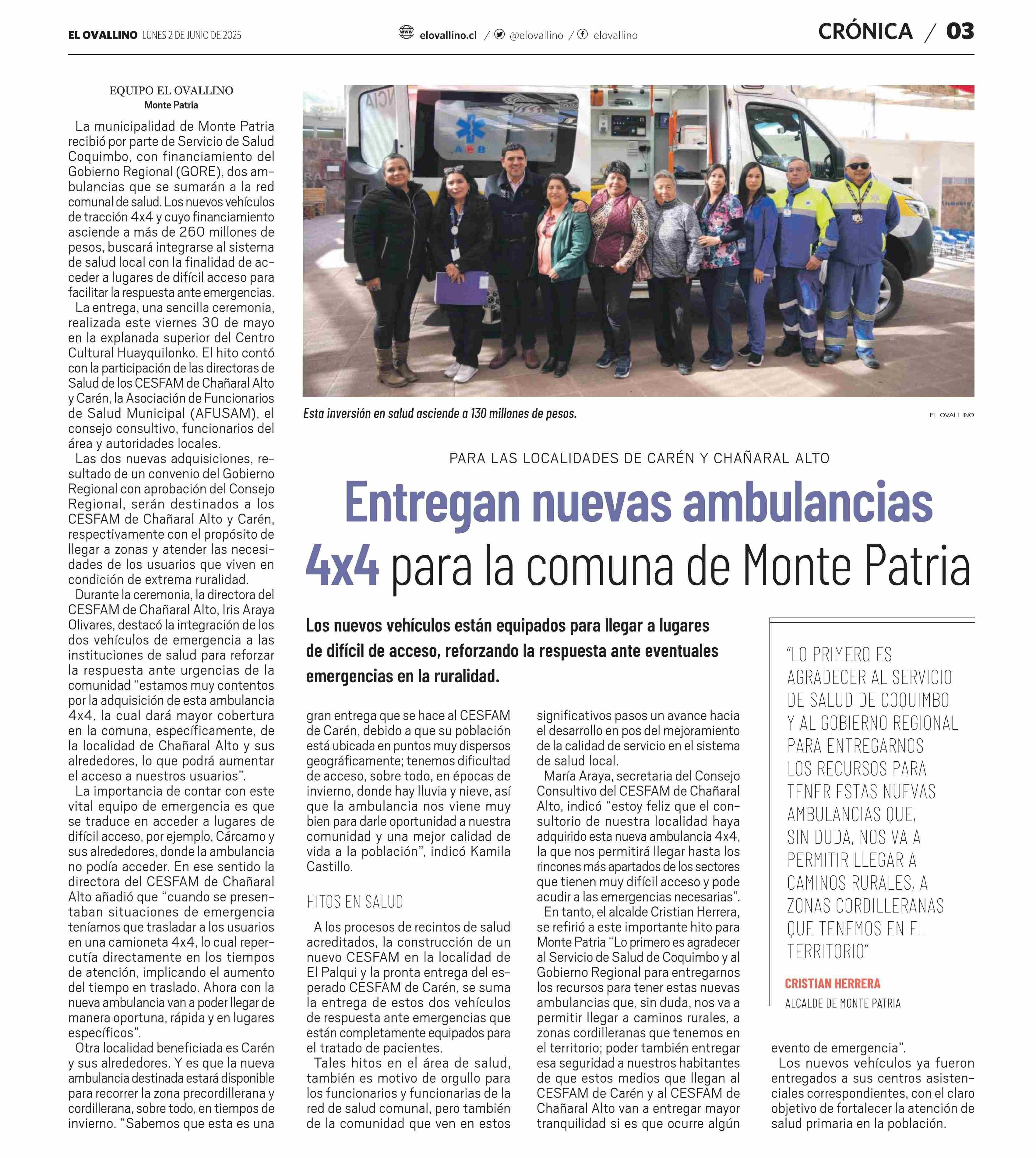 Entregan nuevas ambulancias 4x4 para la comuna de Monte Patria 02-06-2025 El Ovallino |