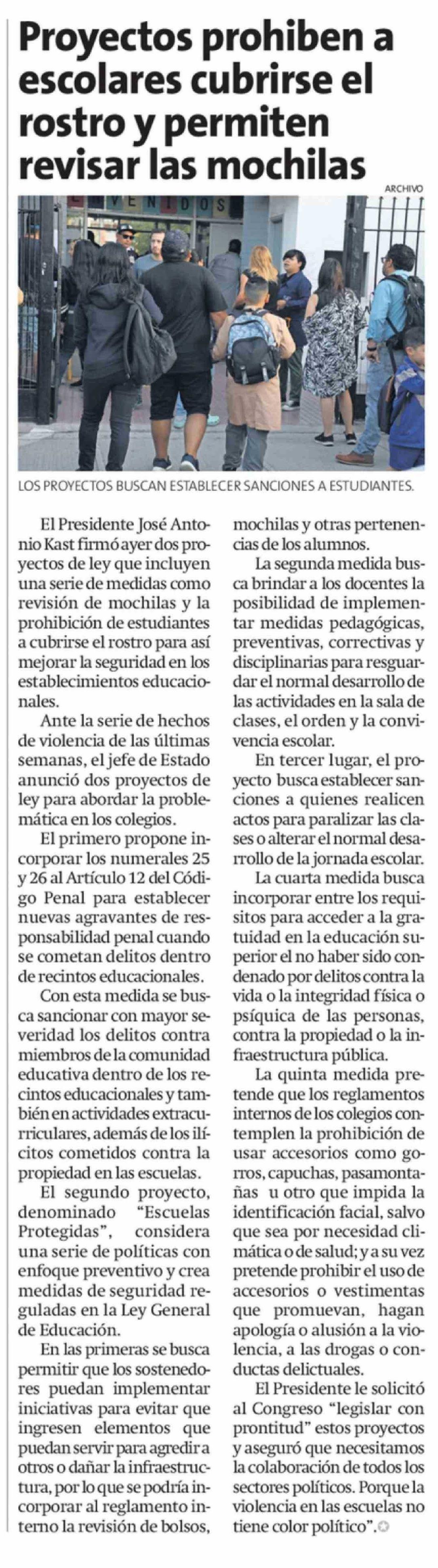Proyectos prohiben a escolares cubrirse el rostro y permiten revisar las mochilas 08-04-2026 La Estrella de Concepción |