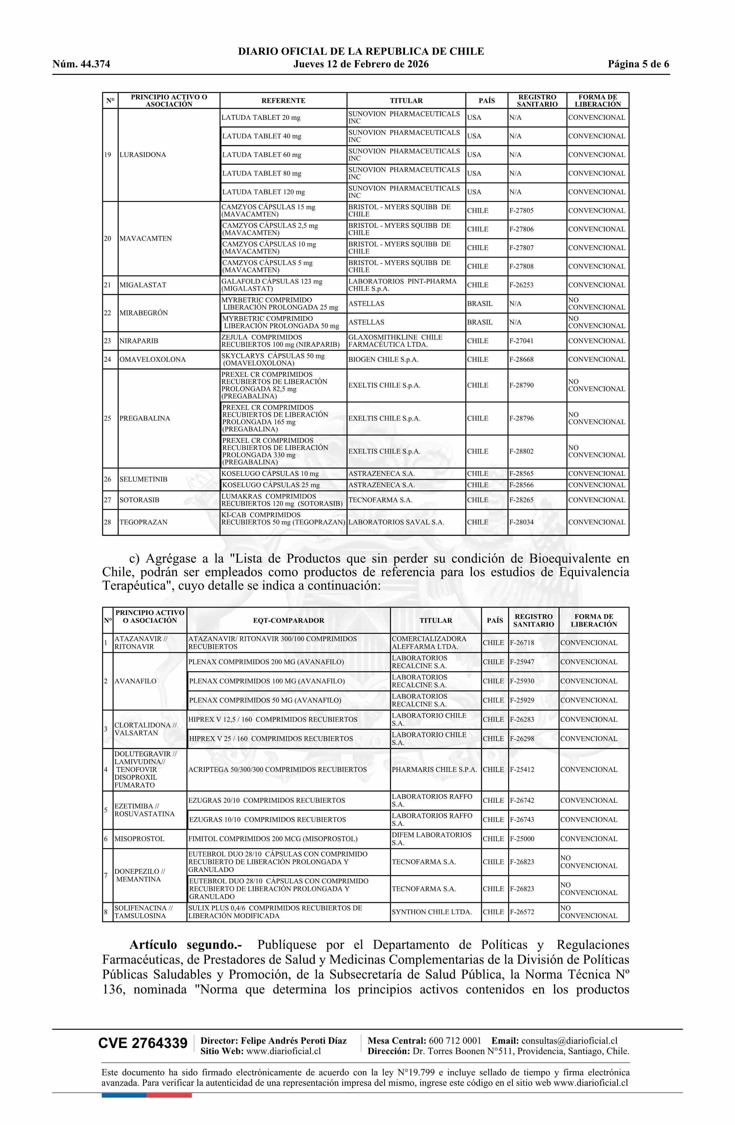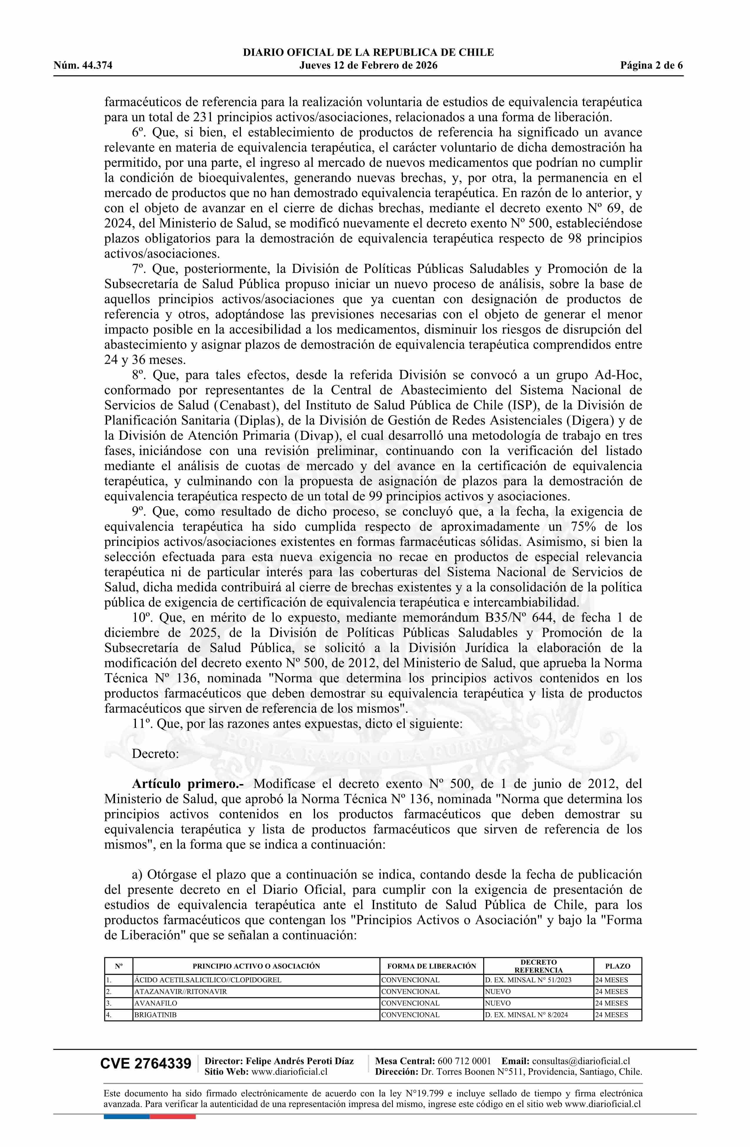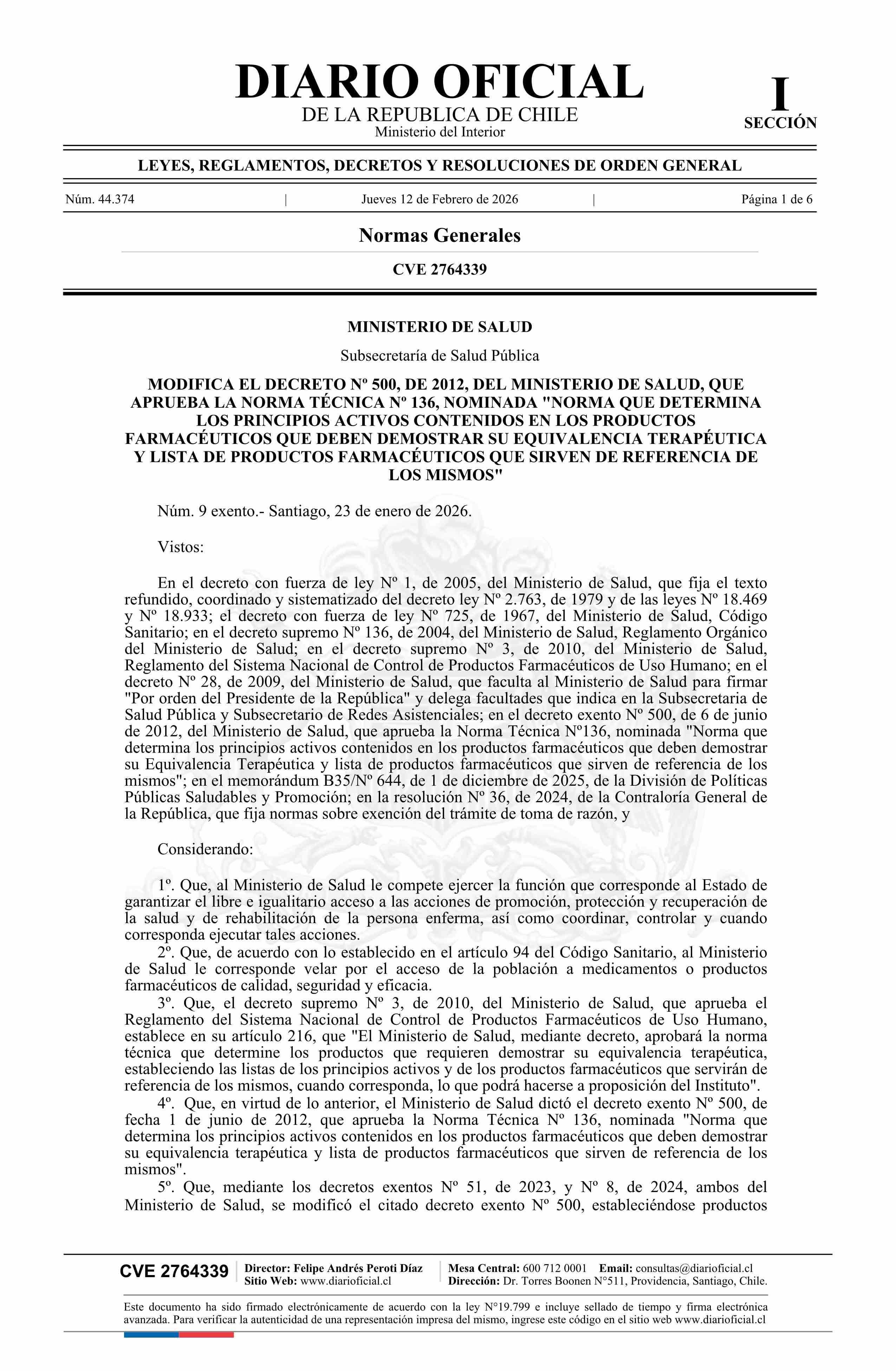 | Título: | Decreto exento número 9, de 2026.- Modifica decreto Nº 500, de 2012, que aprueba la Norma Técnica Nº 136, nominada Norma que determina los principios activos contenidos en los productos farmacéuticos que deben demostrar su equivalencia terapéutica y lista de productos farmacéuticos que sirven de ref |