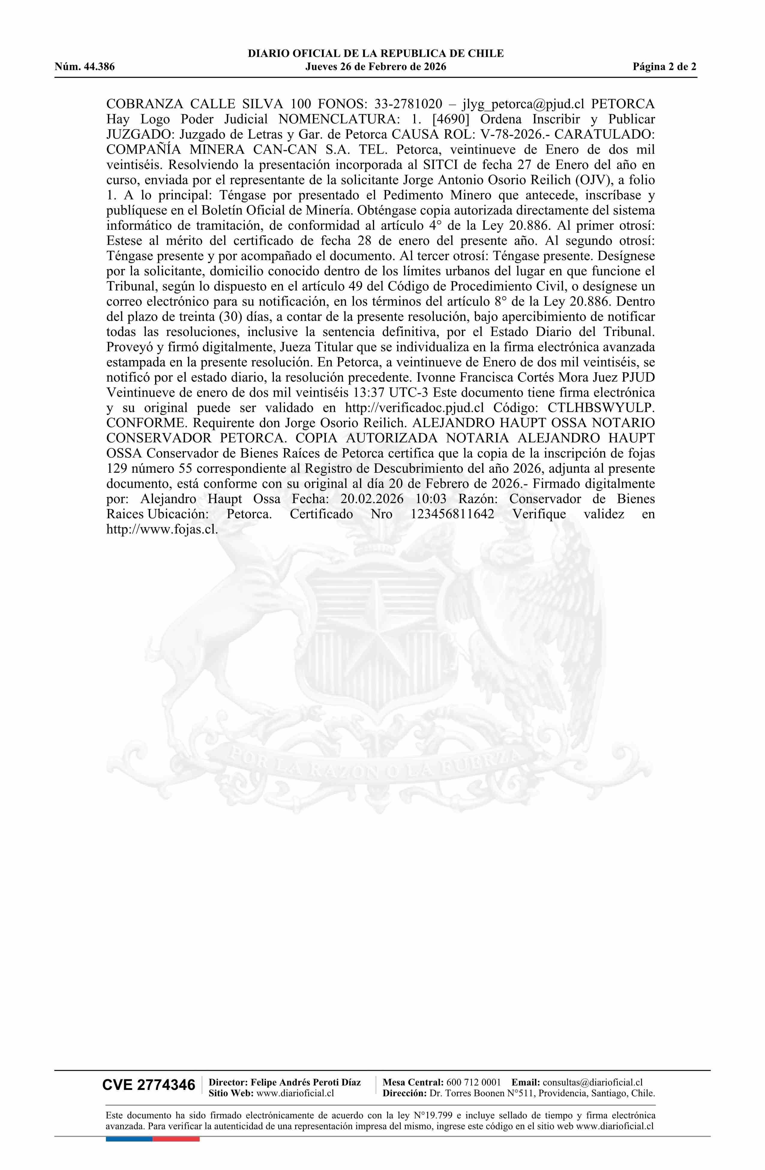 AMANDA 36 / Compañía Minera Can-Can S.A. 26-02-2026 DIARIO OFICIAL CHILE - BOLETÍN OFICIAL DE MINERÍA |