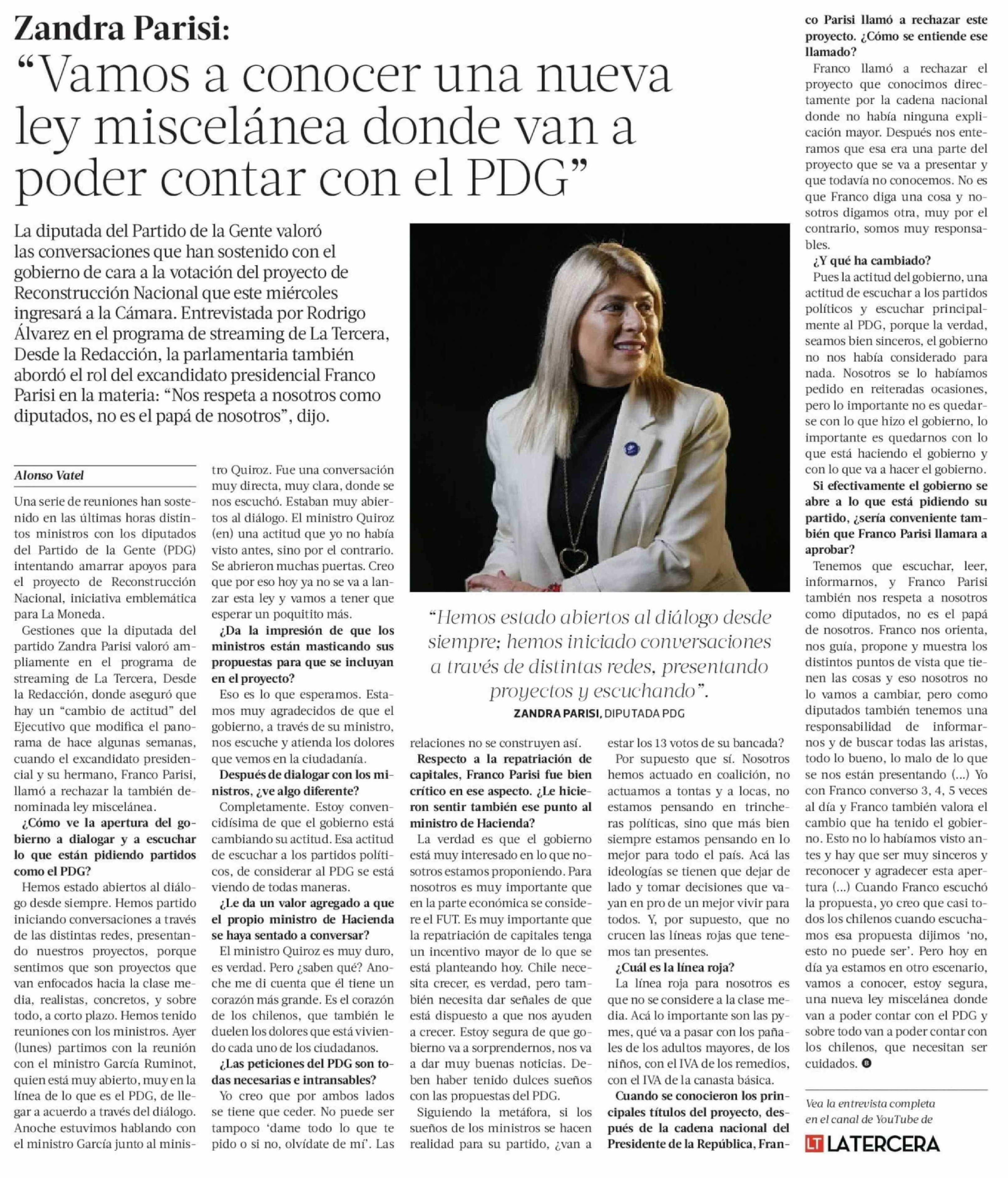 "Vamos a conocer una nueva ley miscelánea donde van a poder contar con el PDG" 22-04-2026 La Tercera |