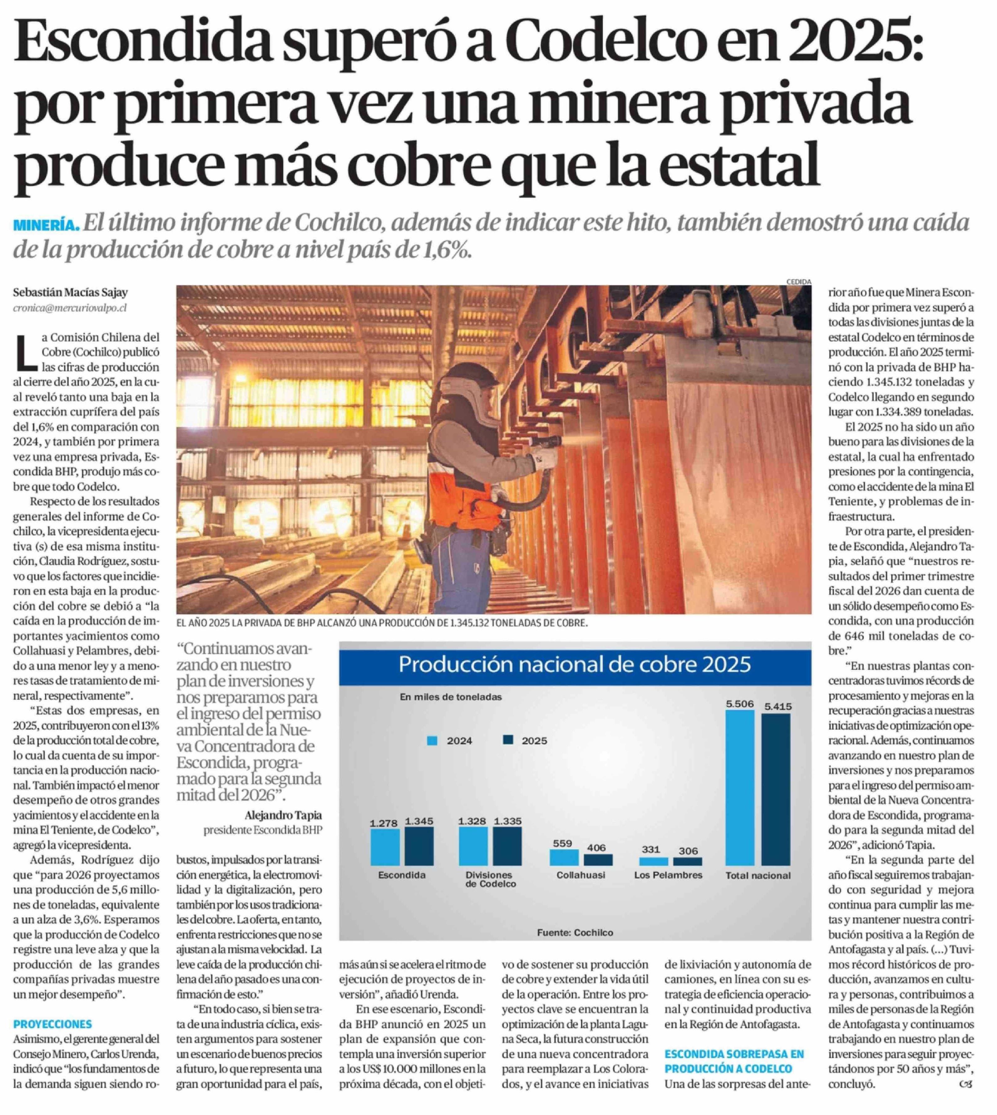 Escondida superó a Codelco en 2025: por primera vez una minera privada produce más cobre que la estatal 15-02-2026 El Mercurio de Antofagasta |