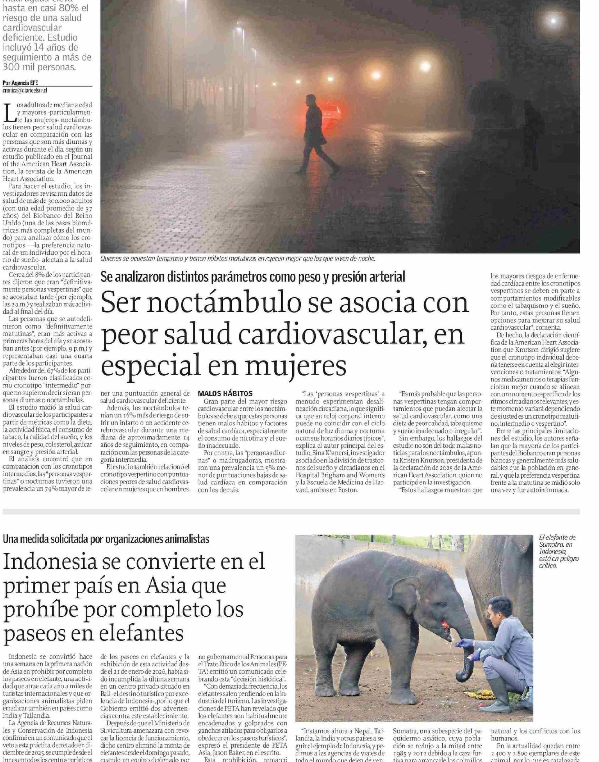 Ser noctámbulo se asocia con peor salud cardiovascular, en especial en mujeres 29-01-2026 El Sur |