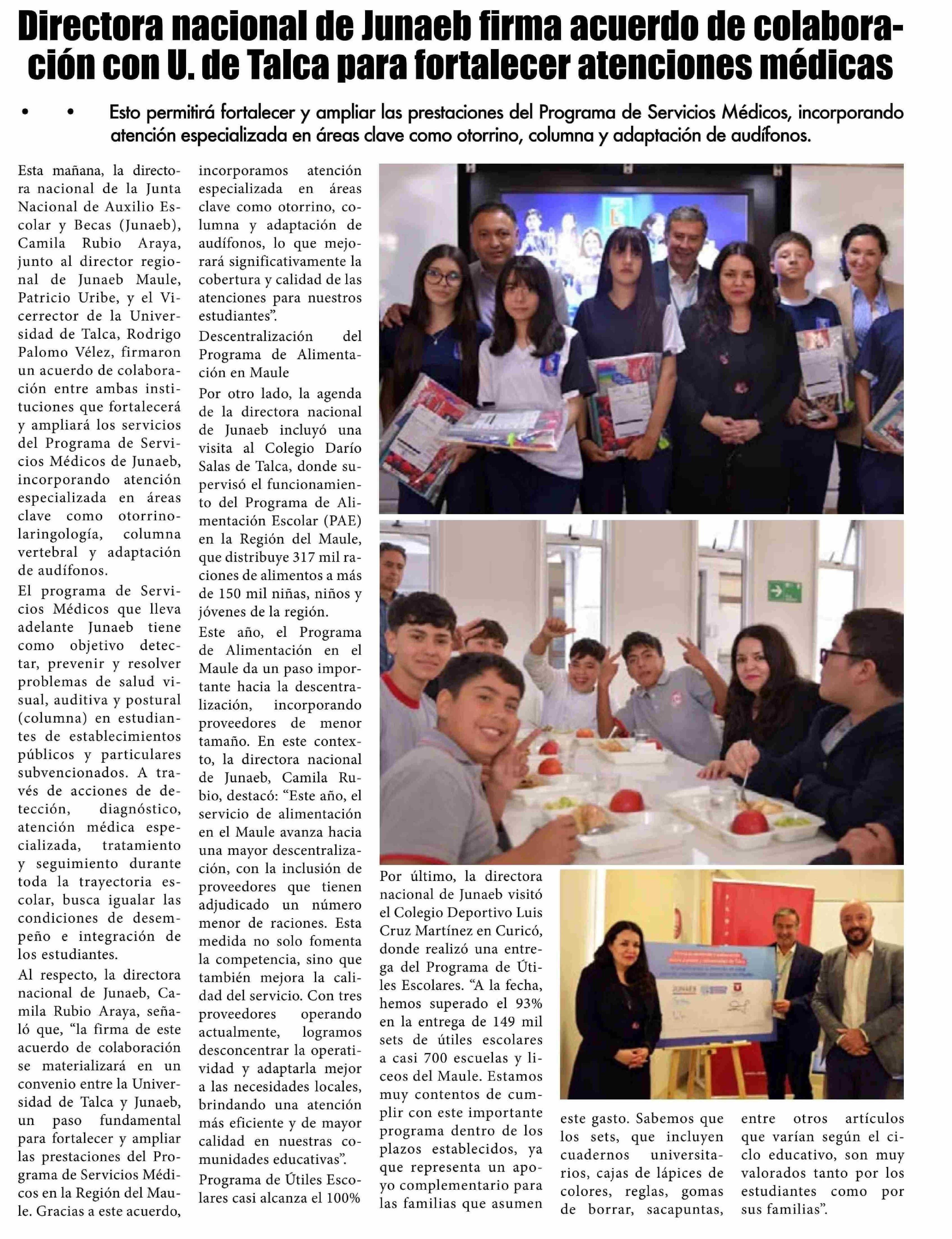 Directora nacional de Junaeb firma acuerdo de colabora- ción con U. de Talca para fortalecer atenciones médicas 29-03-2025 El Lector |