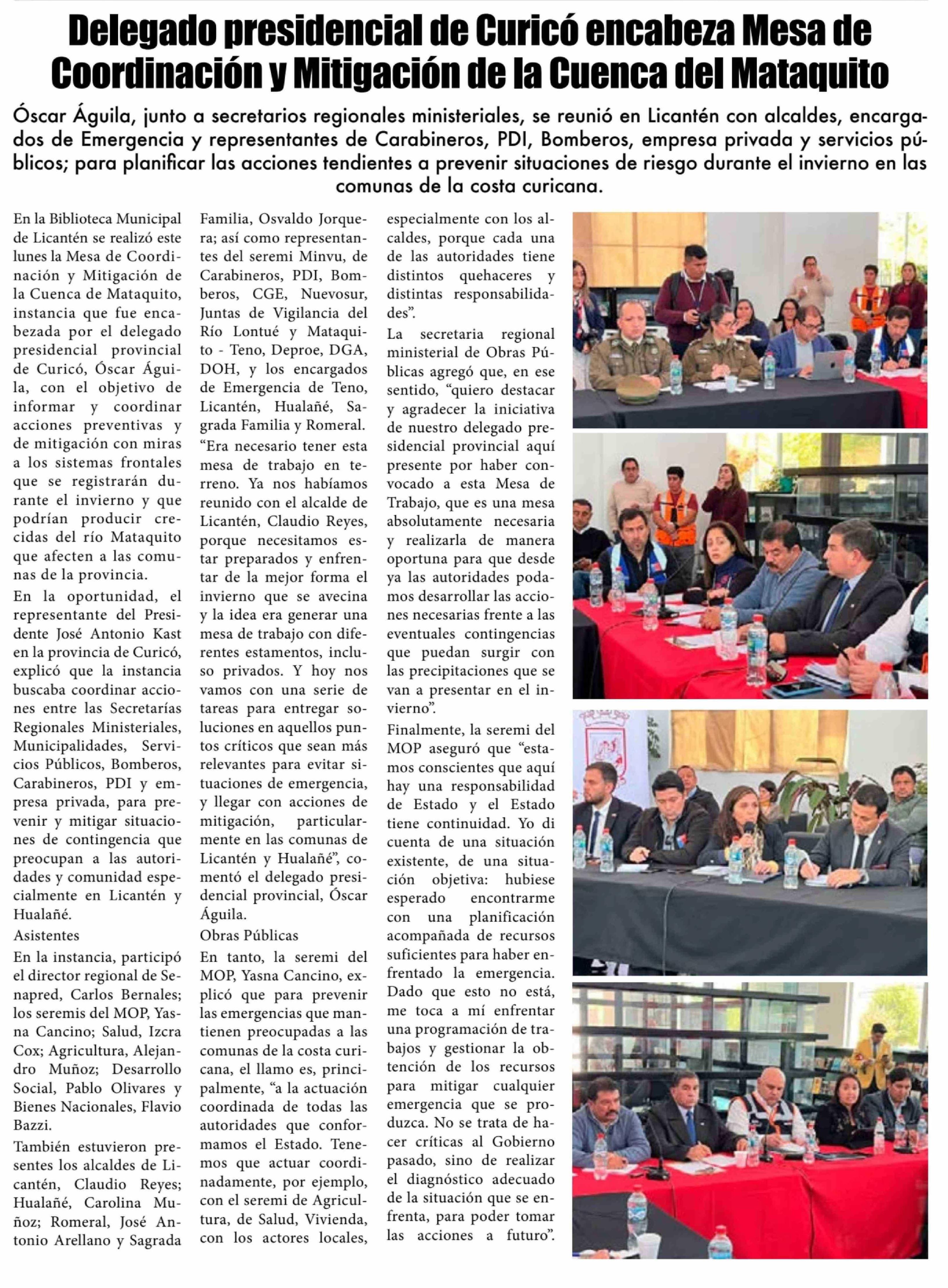| Título: | Delegado presidencial de Curicó encabeza Mesa de Coordinación y Mitigación de la Cuenca del Mataquito |
