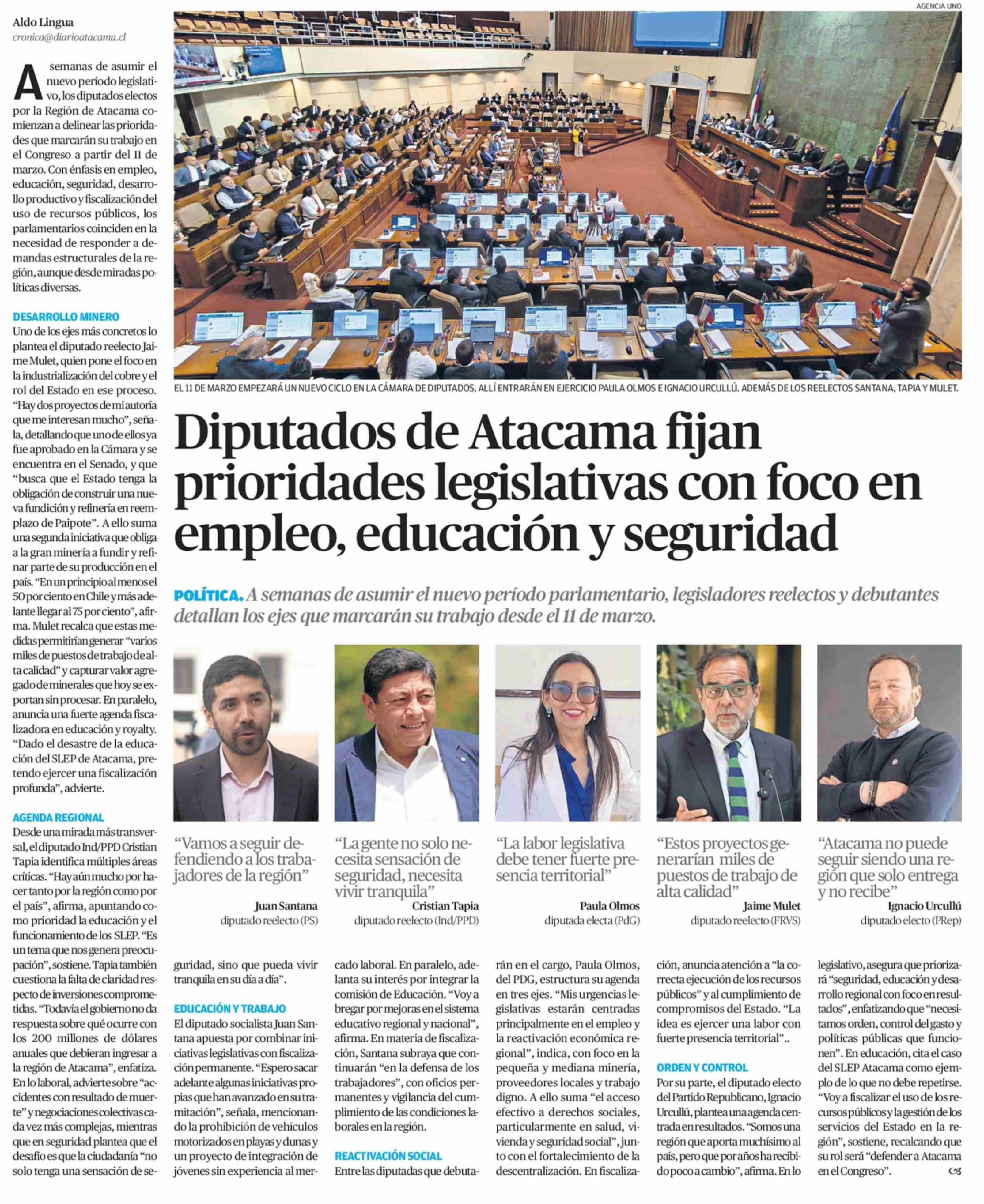 Diputados de Atacama fijan prioridades legislativas con foco en empleo, educación y seguridad 07-02-2026 El Diario de Atacama |