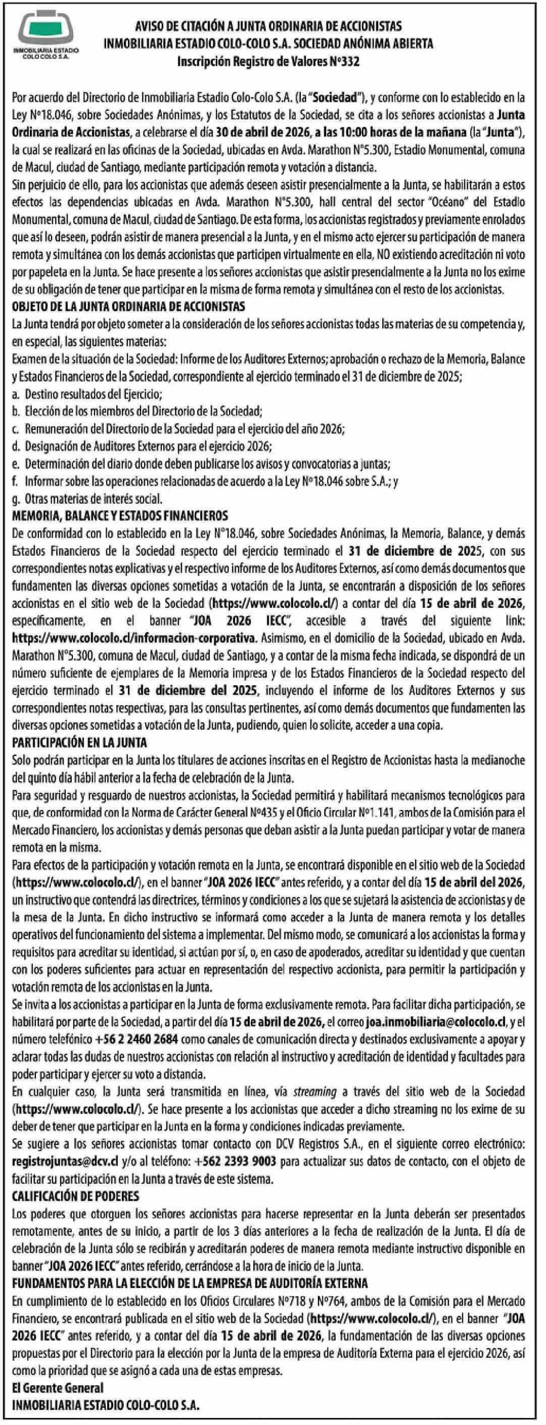 CITACIÓN A JUNTA ORDINARIA DE INMOBILIARIA ESTADIO COLO-COLO S.A. SOCIEDAD ANÓNIMA ABIERTA 15-04-2026 Las Últimas Noticias |