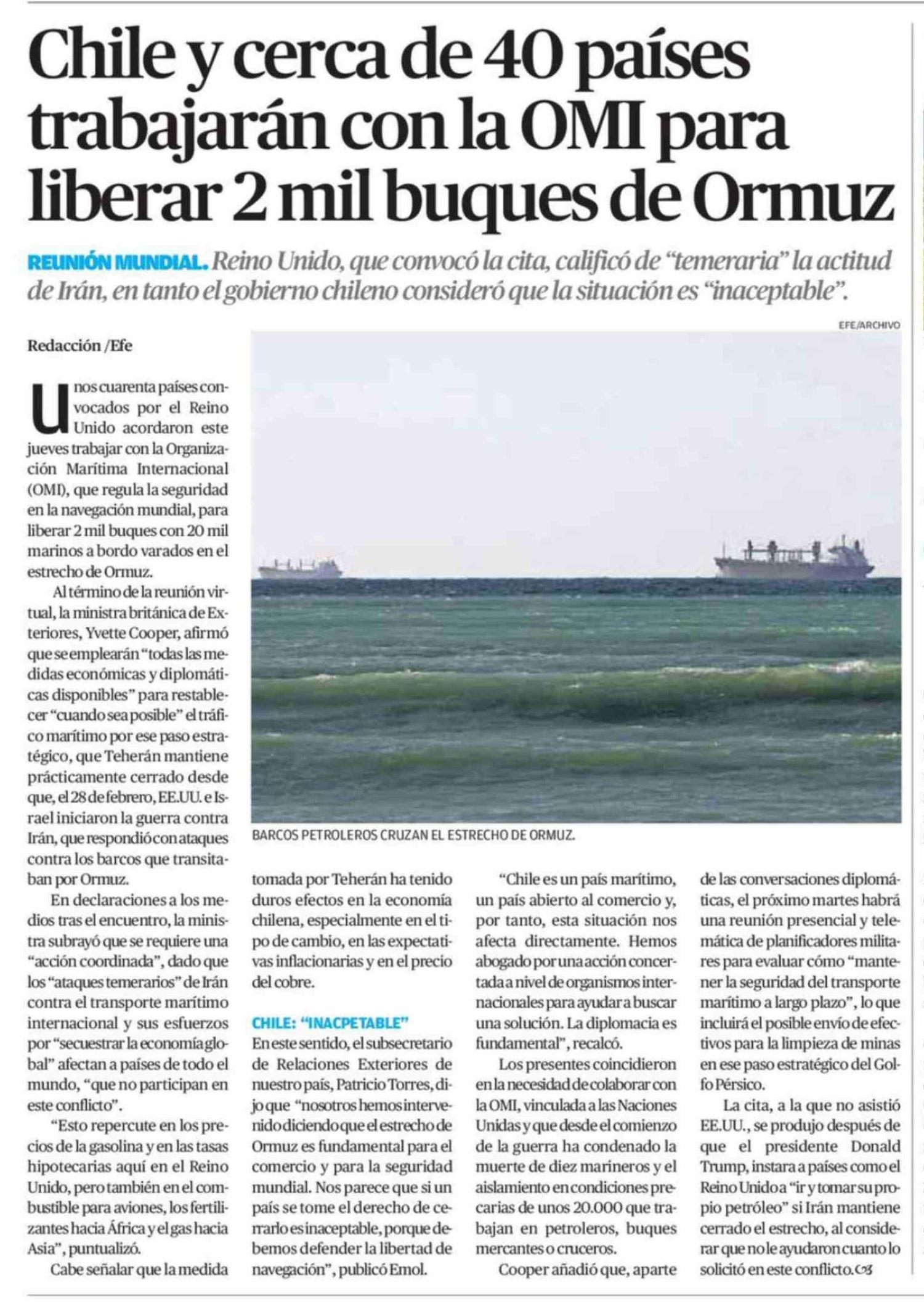 Título: Chile y cerca de 40 países trabajarán con la OMI para liberar 2 mil buques de Ormuz