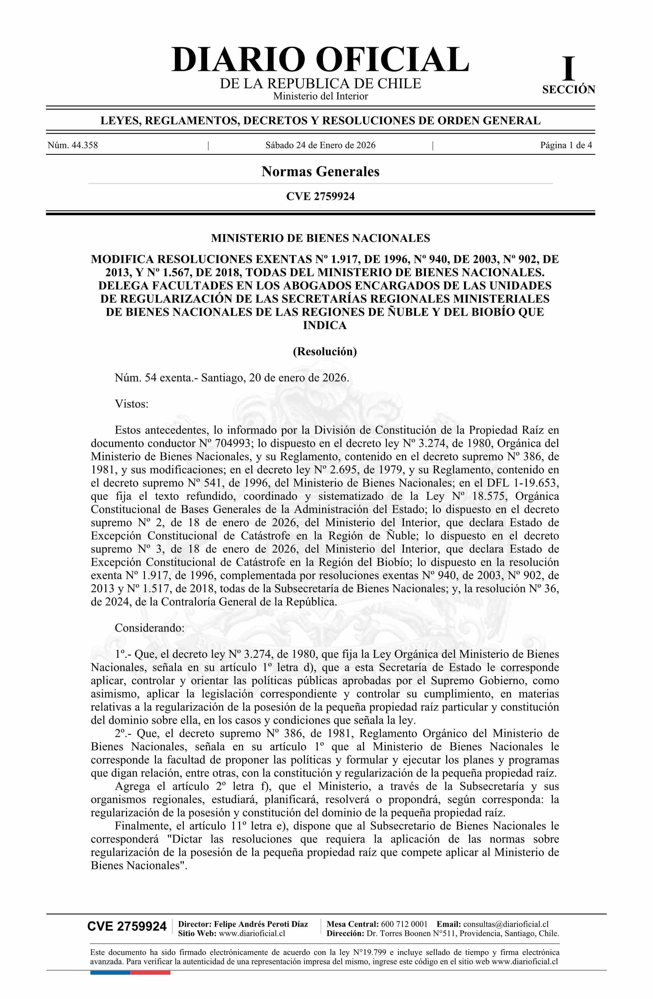 | Título: | Resolución exenta número 54, de 2026.- Modifica resoluciones exentas Nº 1.917, de 1996, Nº 940, de 2003, Nº 902, de 2013, y Nº 1.567, de 2018 y delega facultades en los abogados encargados de las unidades de regularización de las Secretarías Regionales Ministeriales de Bienes Nacionales de las Regio |