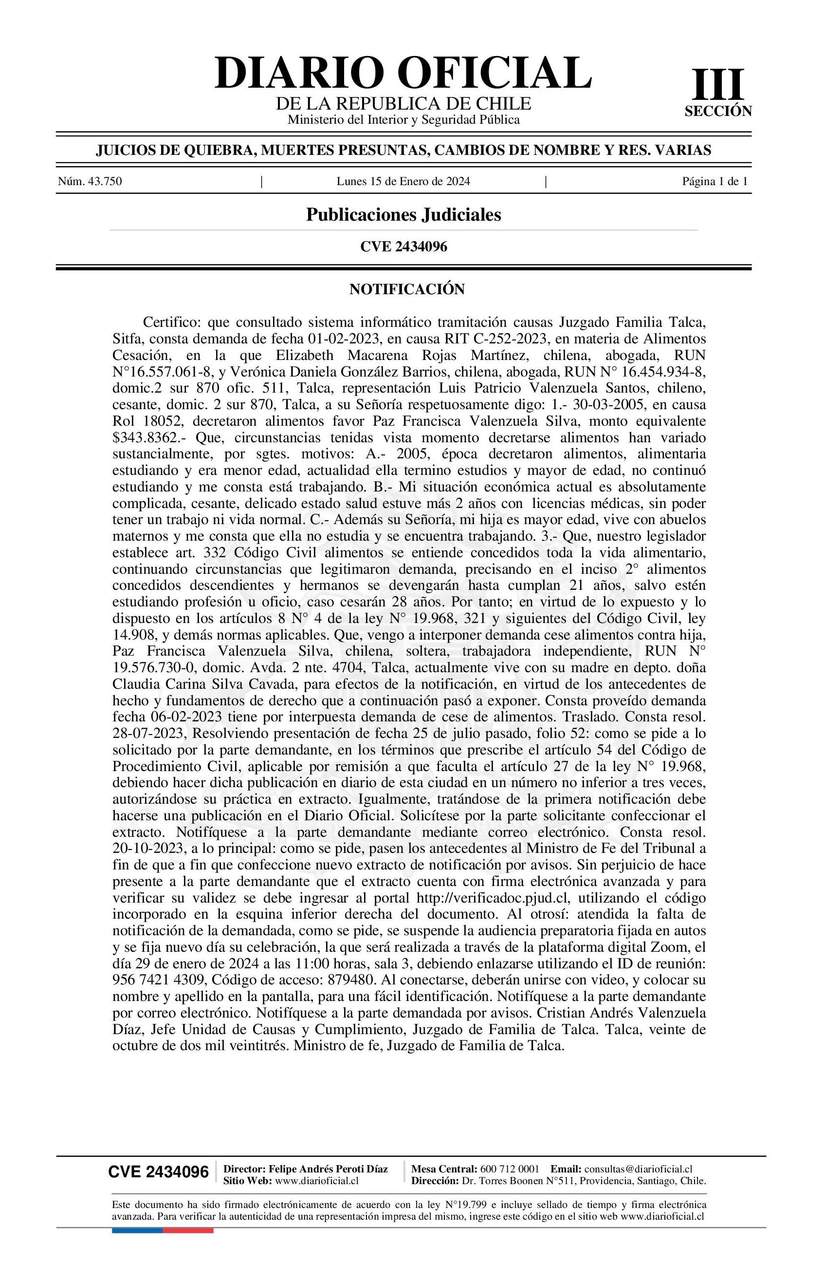 Notificación 15-01-2024 Diario Oficial Edición Electrónica |