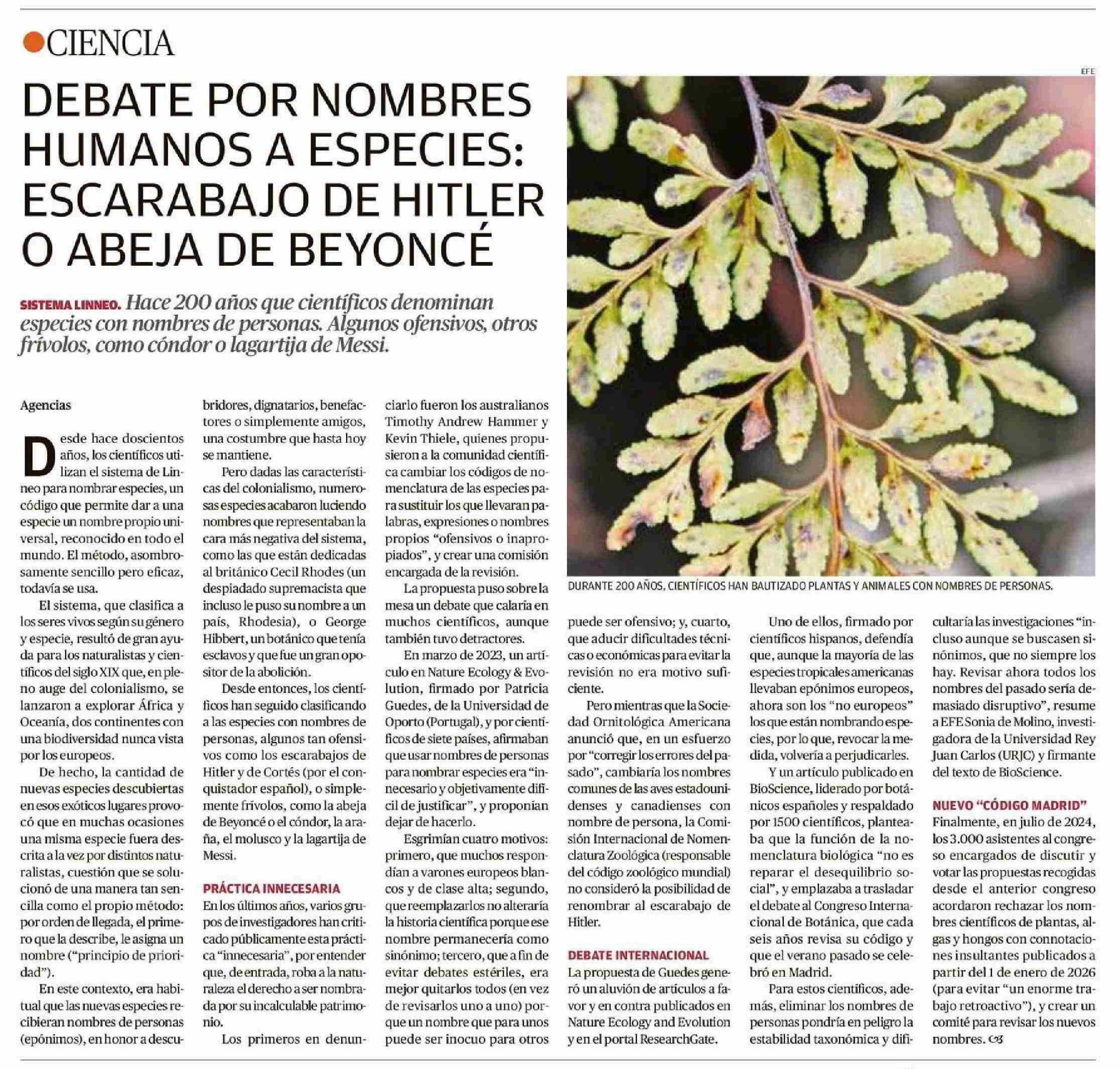 DEBATE POR NOMBRES HUMANOS A ESPECIES: ESCARABAJO DE HITLER O ABEJA DE BEYONCE 19-04-2025 Diario Austral Región de Los Ríos |
