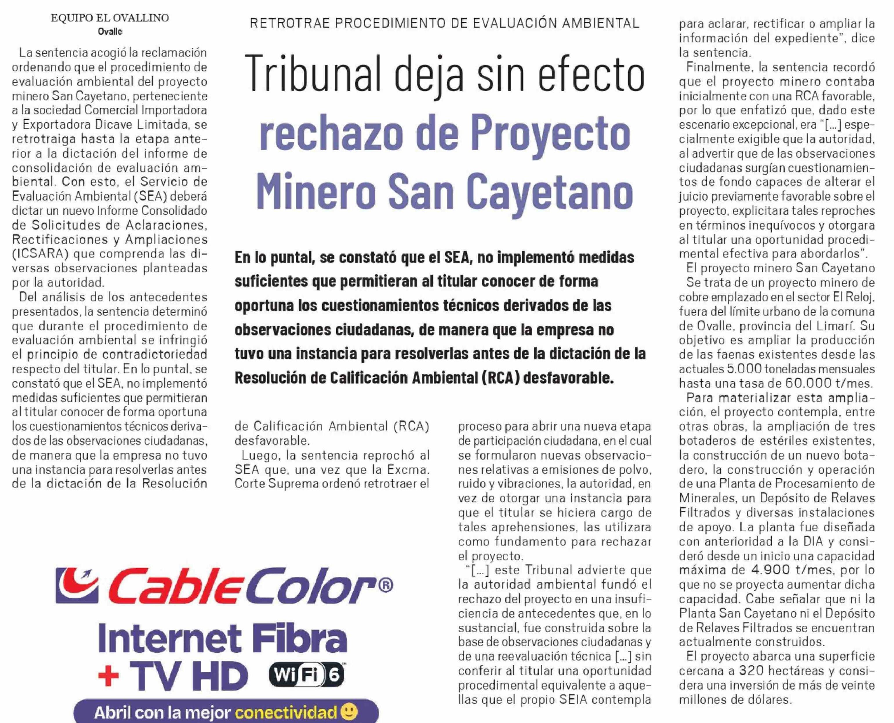 Tribunal deja sin efecto rechazo de Proyecto Minero San Cayetano 27-04-2026 El Ovallino |