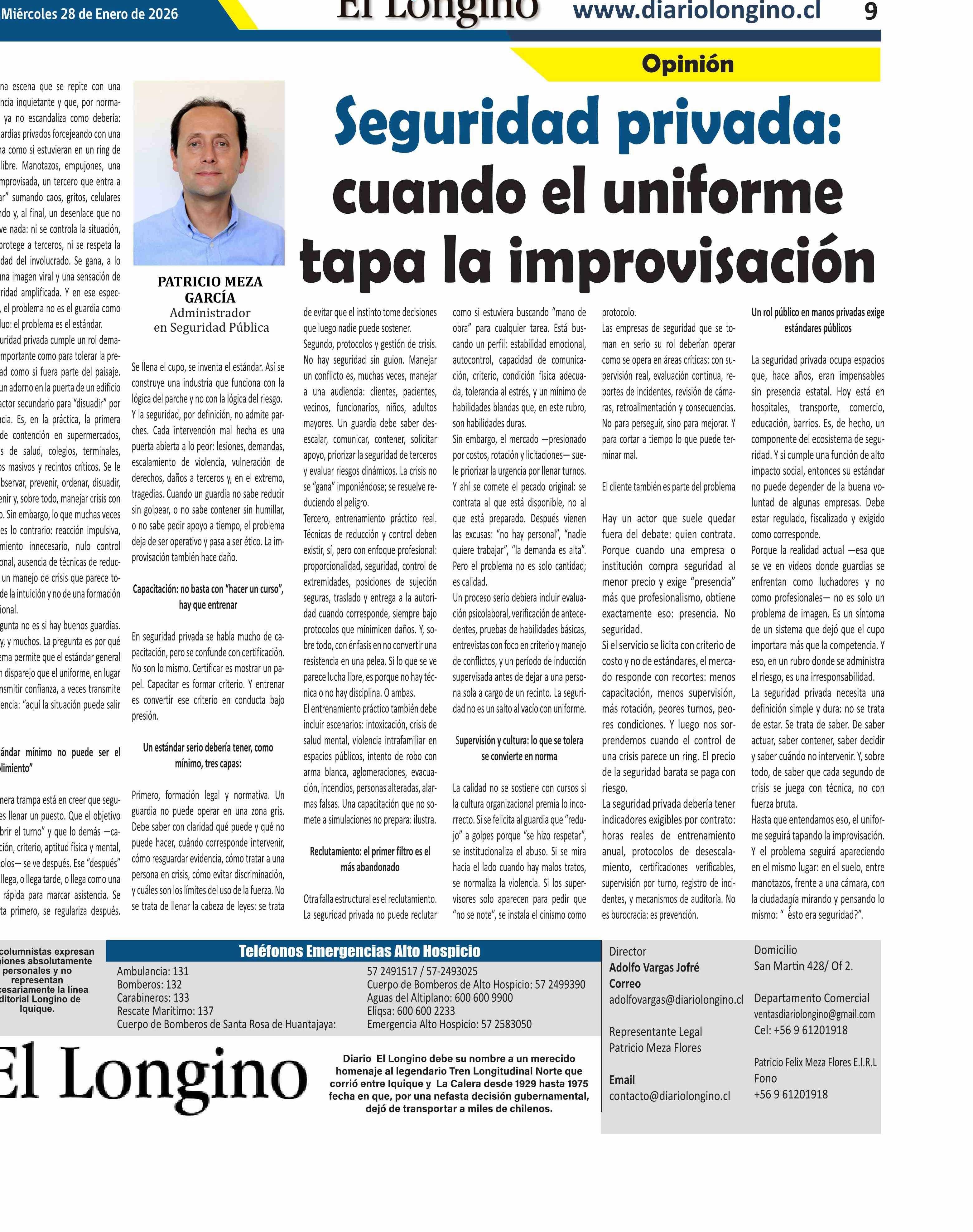 Columnas de Opinión: Seguridad privada: cuando el uniforme tapa la improvisación 28-01-2026 El Longino |