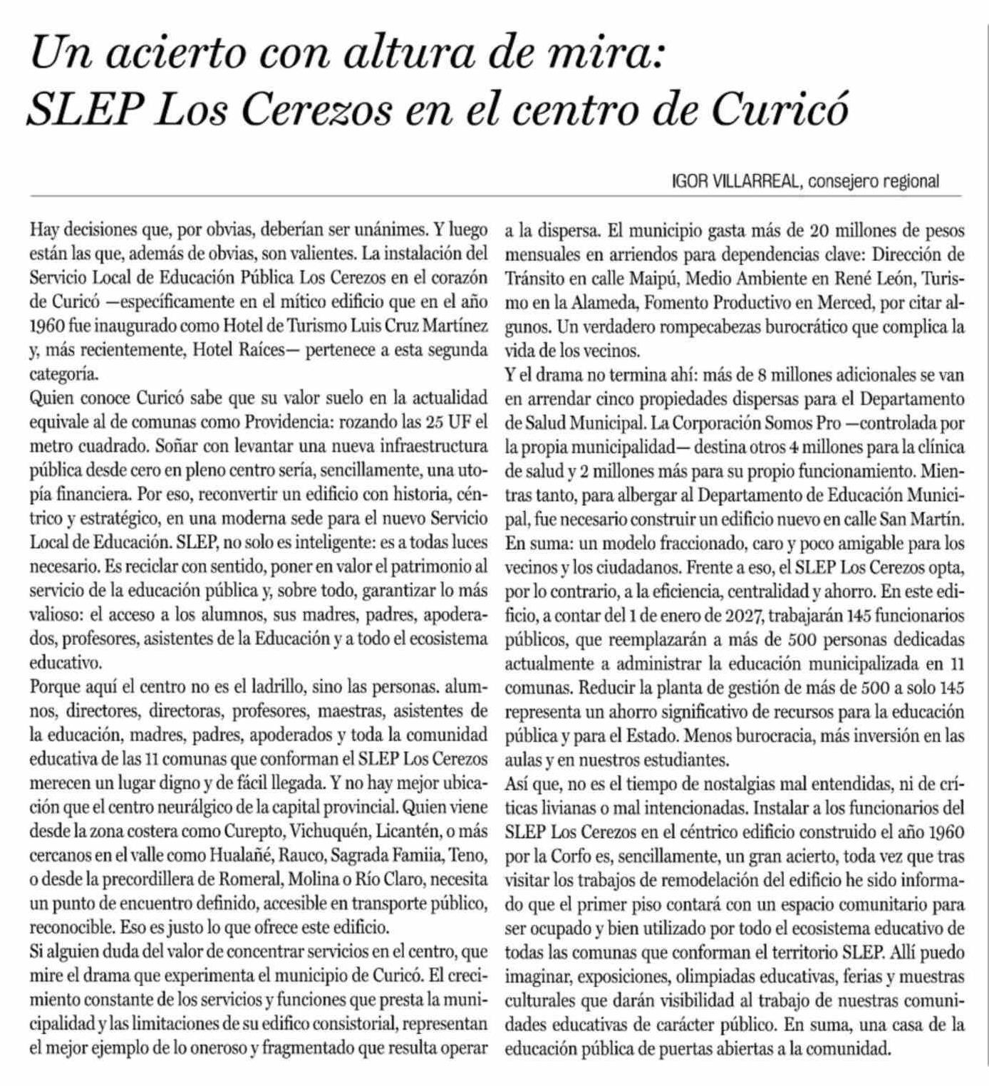 Título: Columnas de Opinión: Un acierto con altura de mira: SLEP Los Cerezos en el centro de Curicó