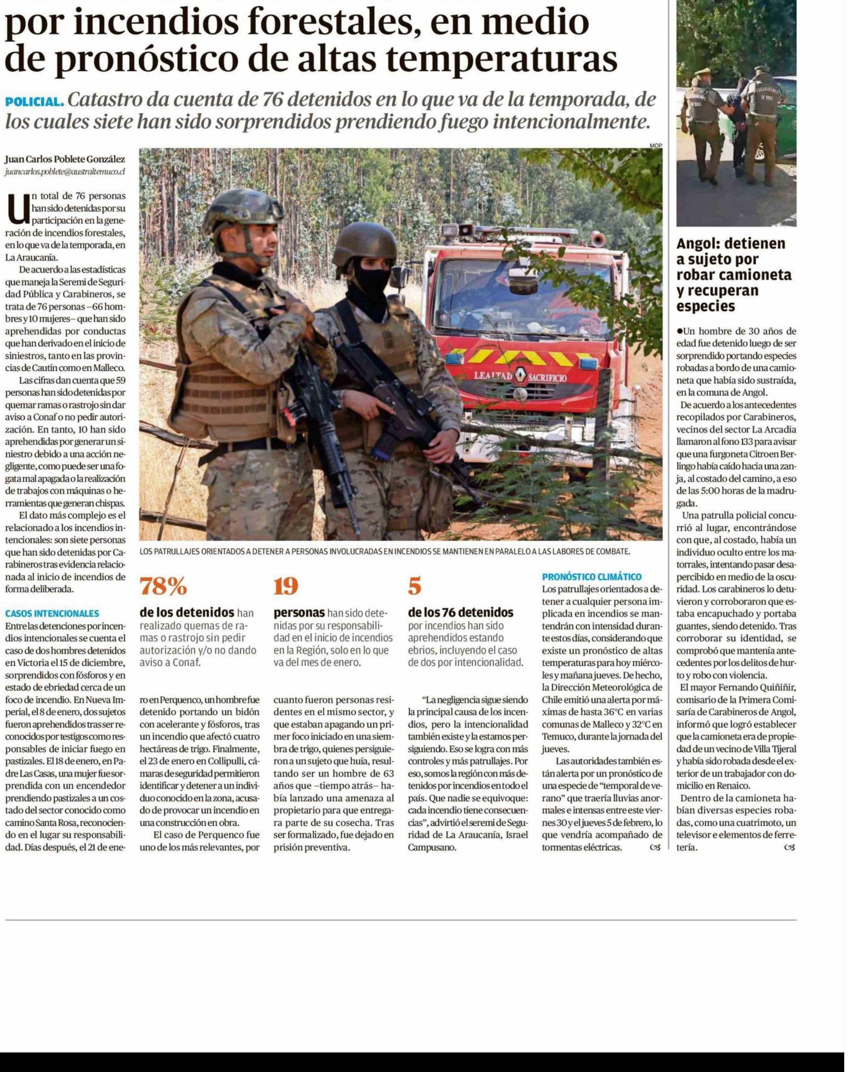 La Araucanía: aumentan detenidos por incendios forestales, en medio de pronóstico de altas temperaturas 28-01-2026 El Austral de la Araucanía |