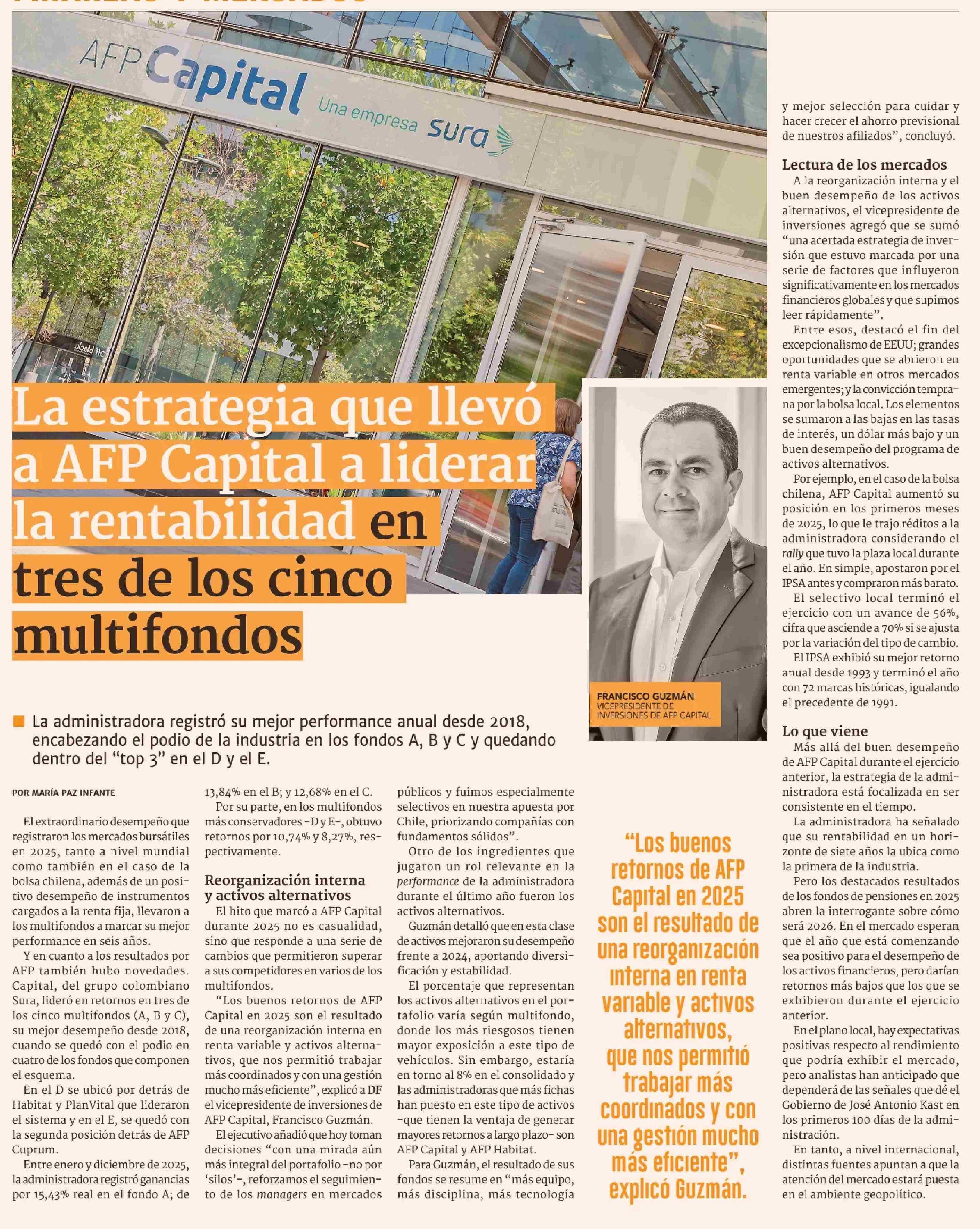 La estrategia que llevó a AFP Capital a liderar la rentabilidad en tres de los cinco multifondos 19-01-2026 Diario Financiero |