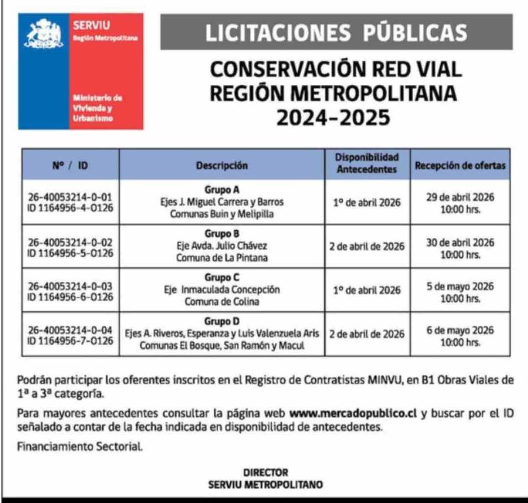 Título: Aviso Licitaciones: LICITACIONES PÚBLICAS CONSERVACIÓN RED VIAL REGION METROPOLITANA 2024-2025