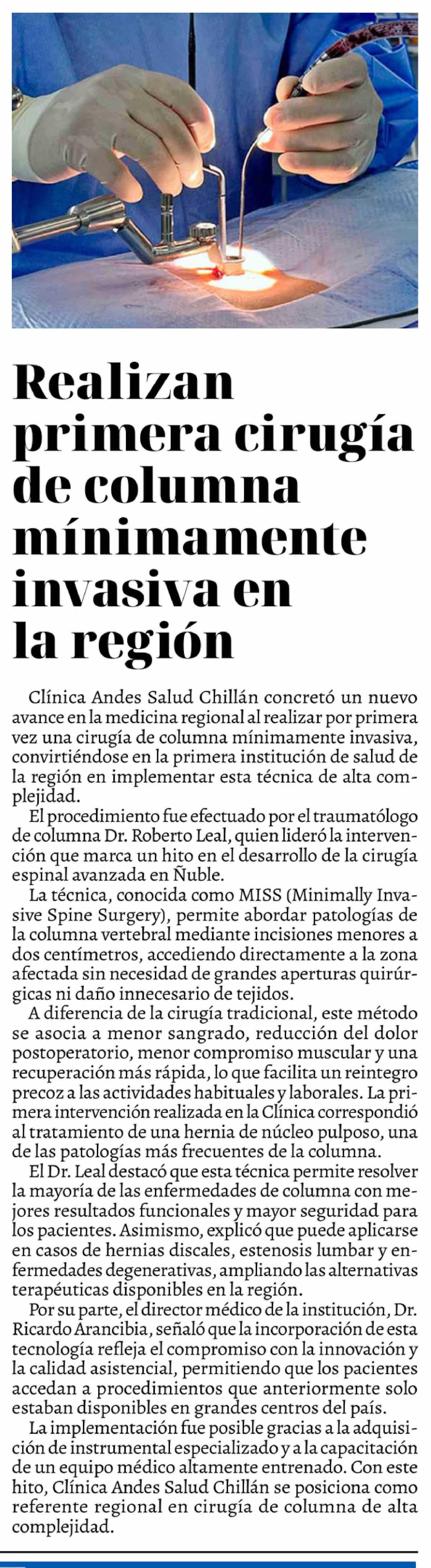 Título: Realizan primera cirugía de columna mínimamente invasiva en la región
