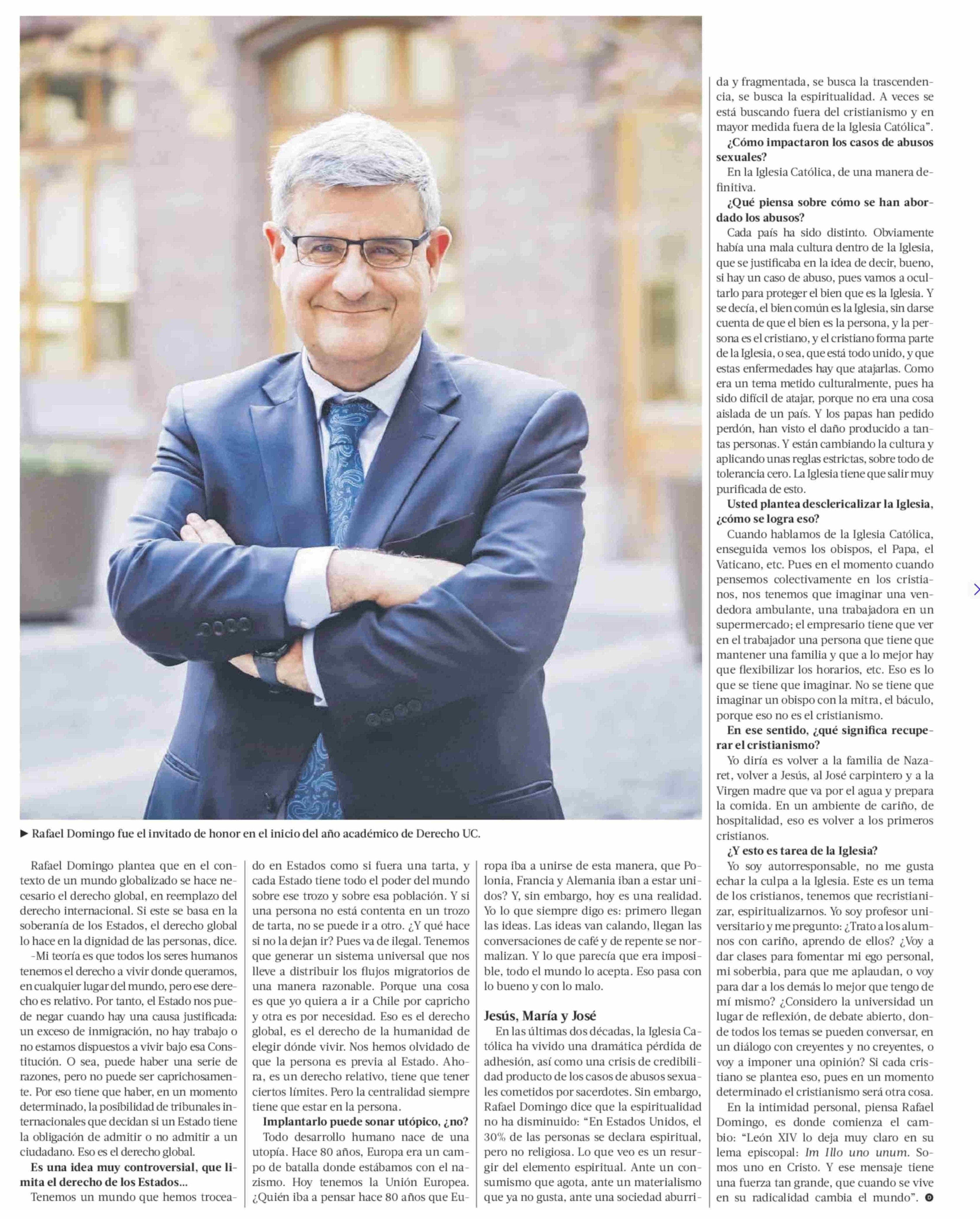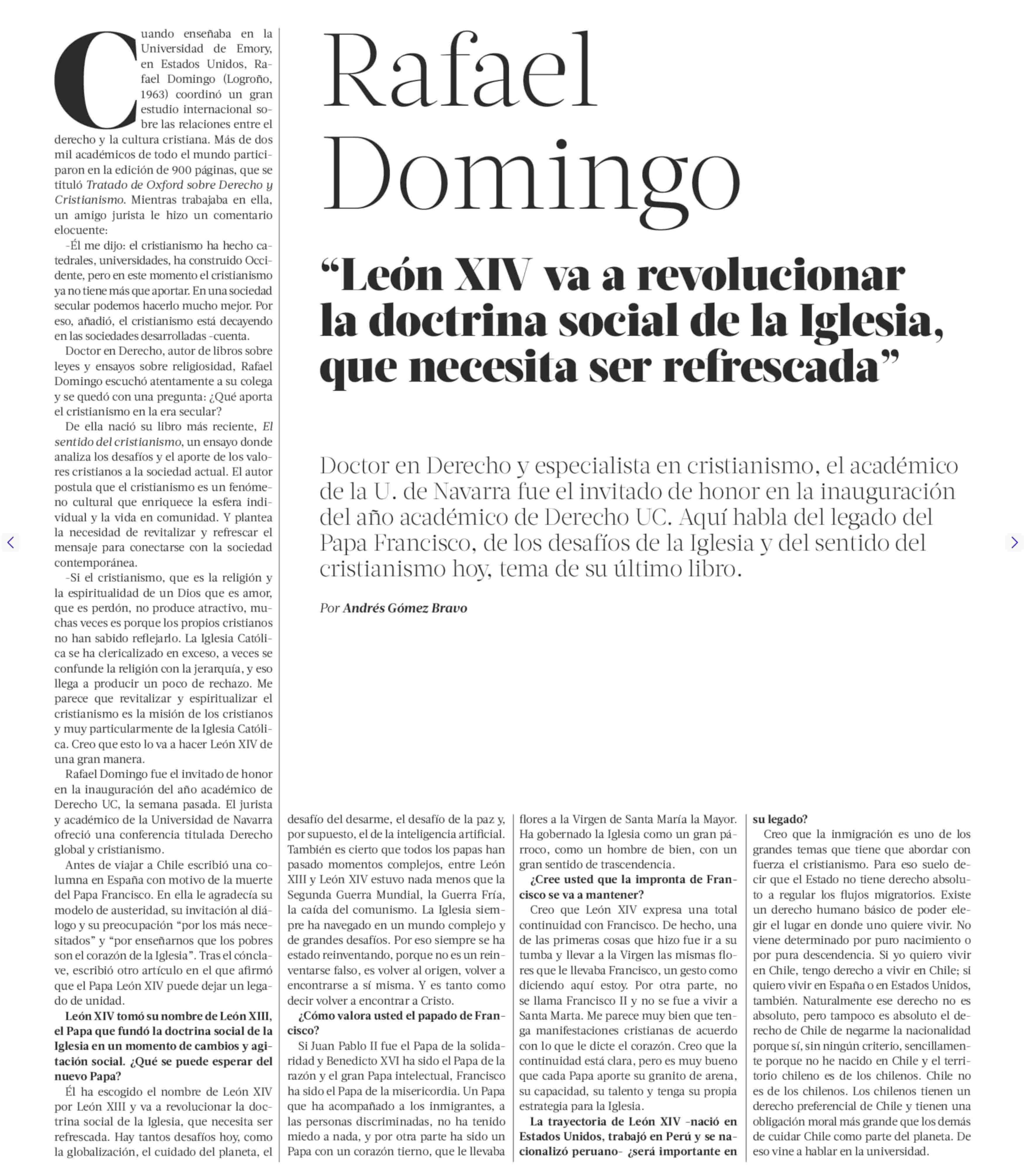 Ralael Domingo “León XIV va a revolucionar la doctrina social de la Iglesia, que necesita ser refrescada” 25-05-2025 La Tercera |