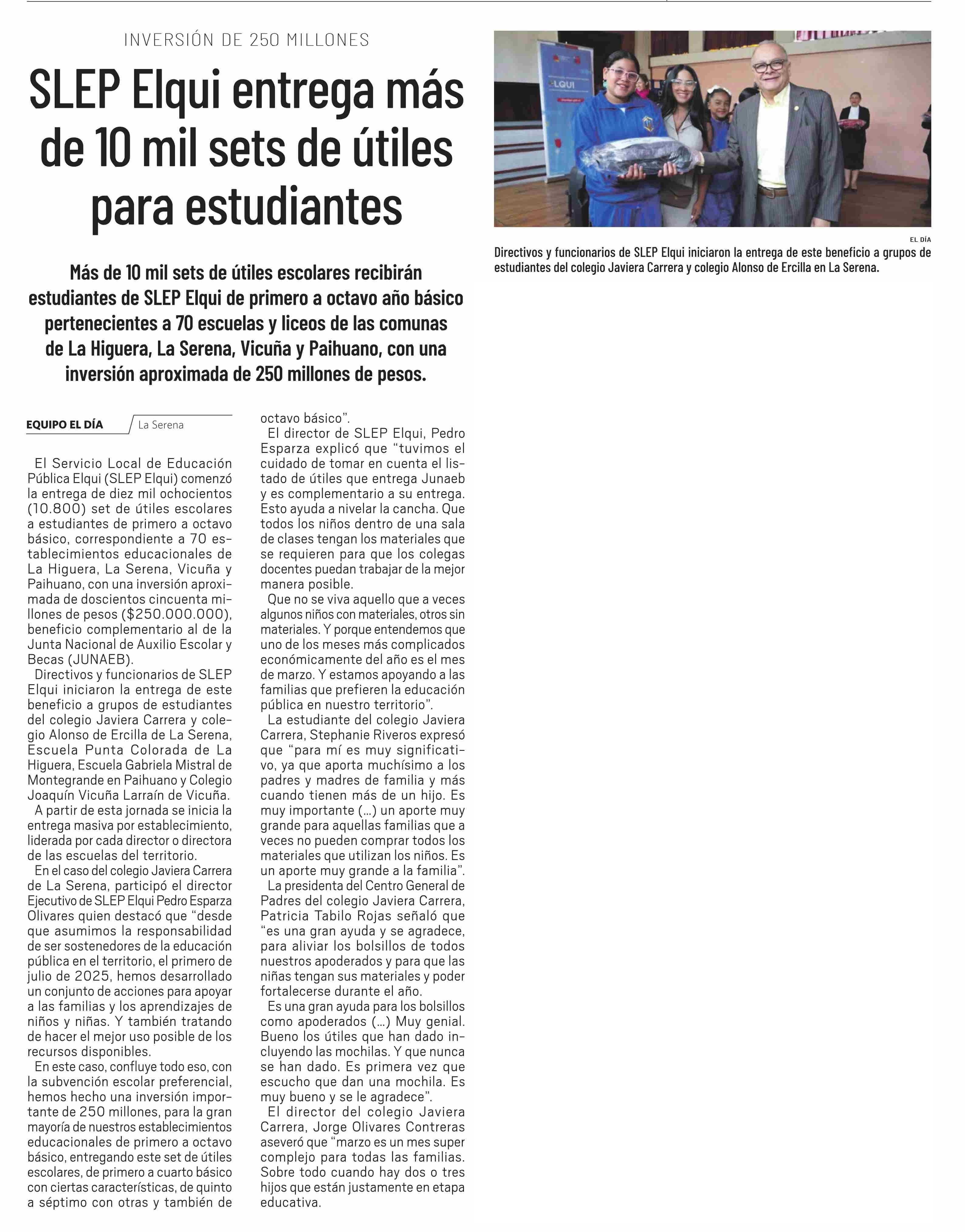 SLEP Elqui entrega más de 10 mil sets de útiles para estudiantes 06-03-2026 El Día |