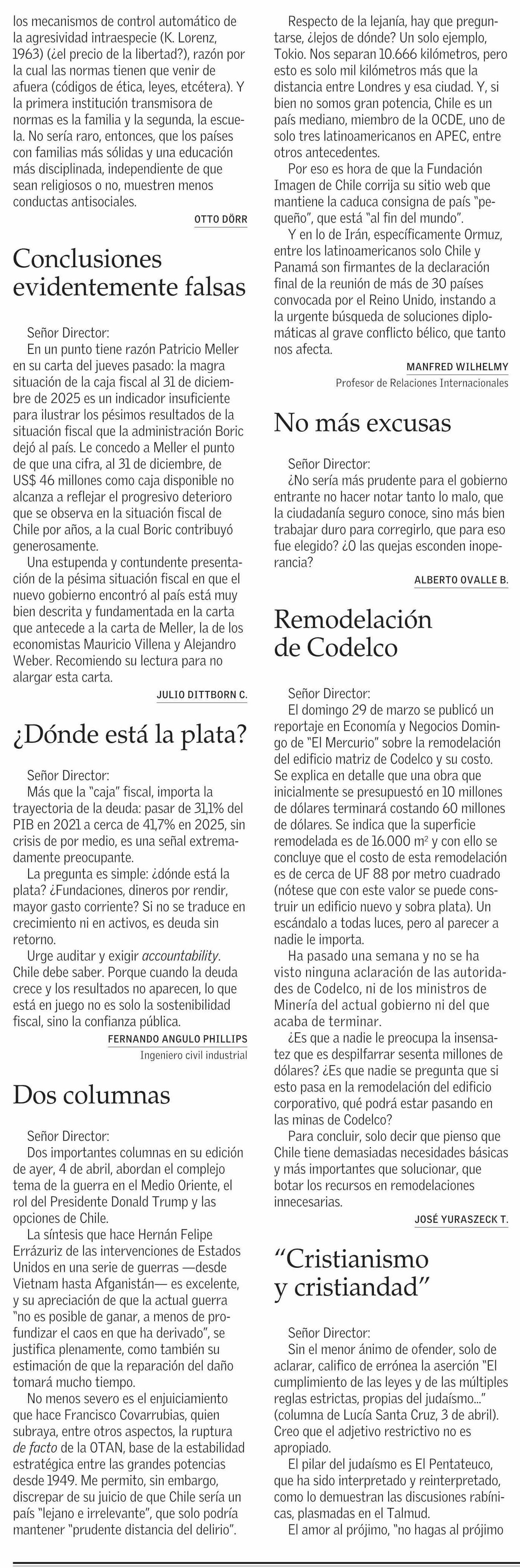 Cartas: Dos columnas 05-04-2026 El Mercurio |