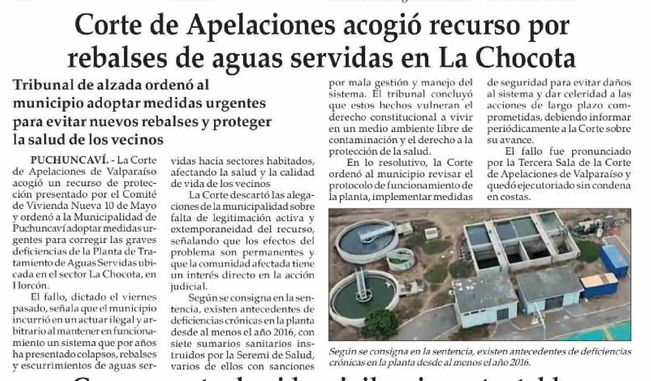 | Título: | Corte de Apelaciones acogió recurso por rebalses de aguas servidas en La Chocota |