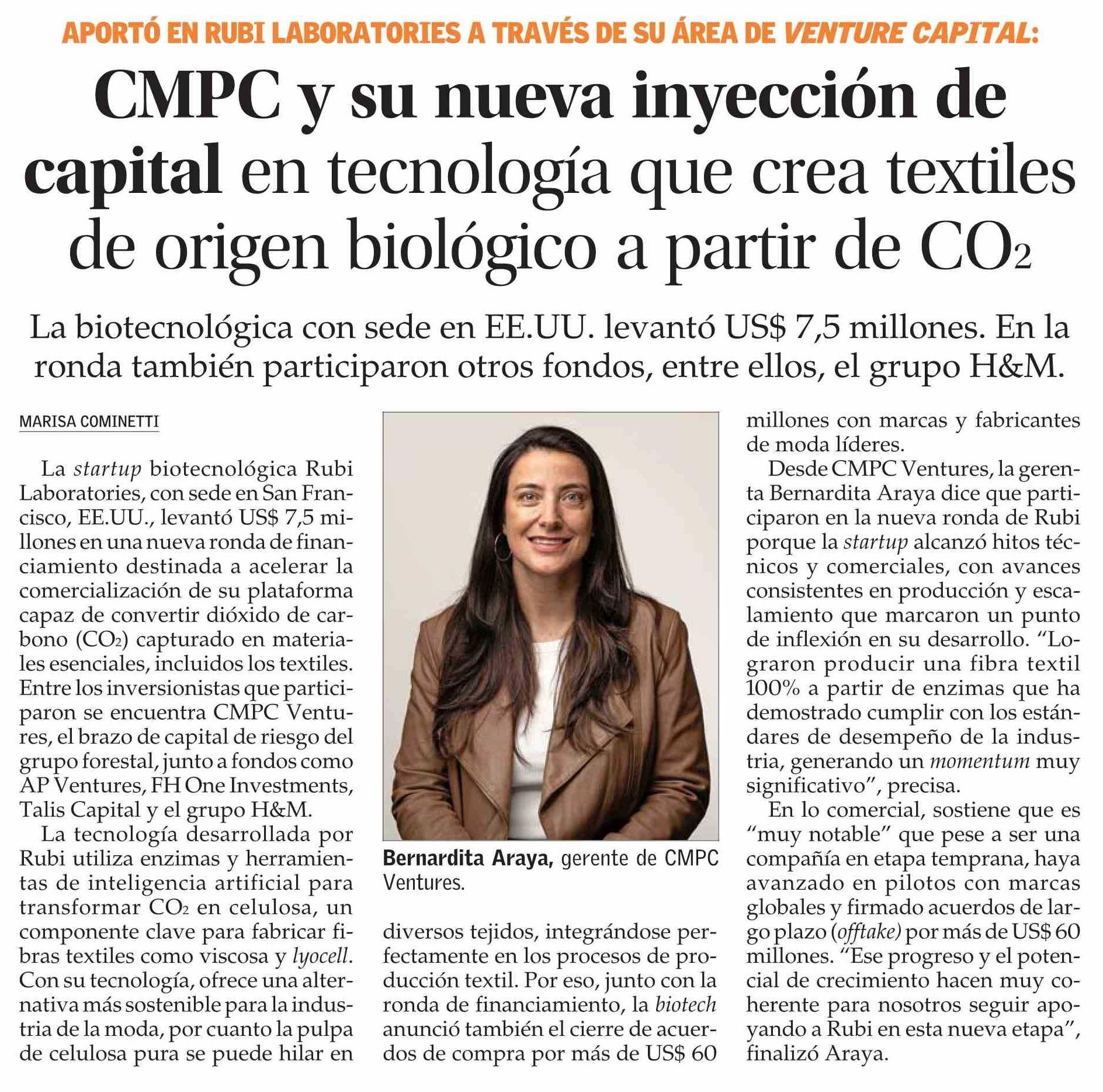 CMPC y su nueva inyección de capital en tecnología que crea textiles de origen biológico a partir de CO2 28-03-2026 El Mercurio |