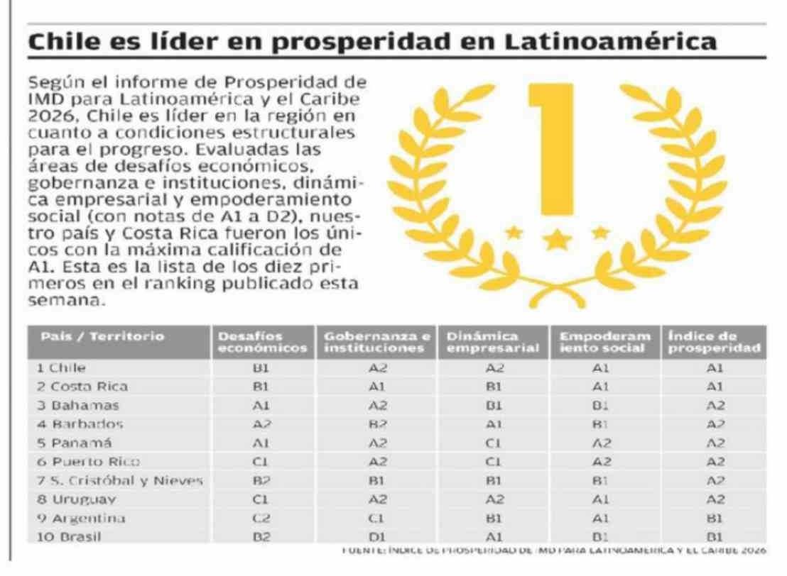 | Título: | Chile es líder en prosperidad en Latinoamérica Según el informe de Prosperidad de IMD para Latinoamérica y el Caribe 2026, Chile es líder en la región en cuanto a condiciones estructurales para el progreso. Evaluadas las áreas de desafíos económicos, gobernanza e instituciones, dinámica empresarial |