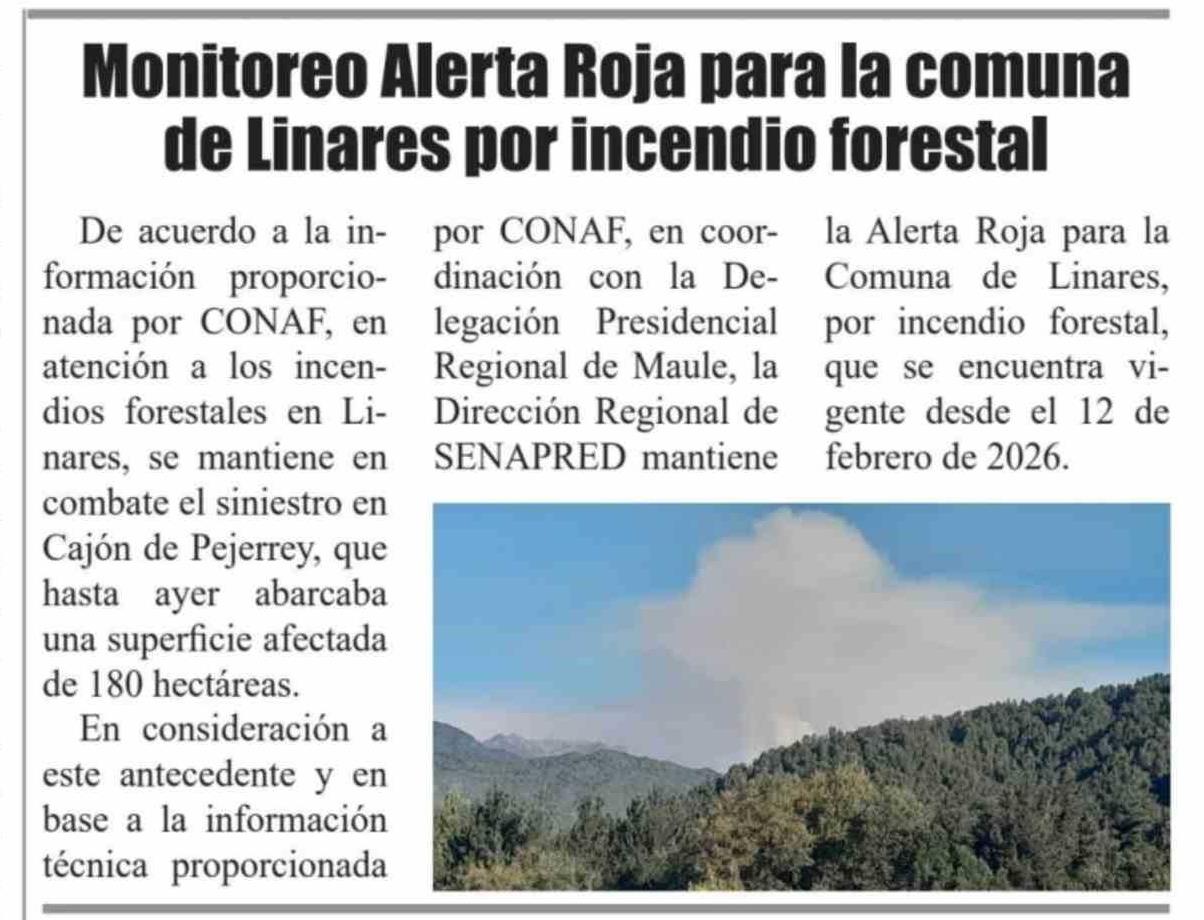 Monitoreo Alerta Roja para la comuna de Linares por incendio forestal 15-02-2026 El Heraldo |