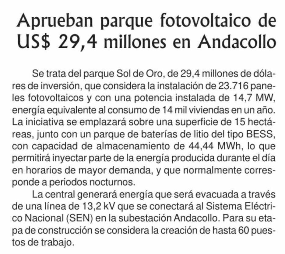 | Título: | Aprueban parque fotovoltaico de US$ 29,4 millones en Andacollo |