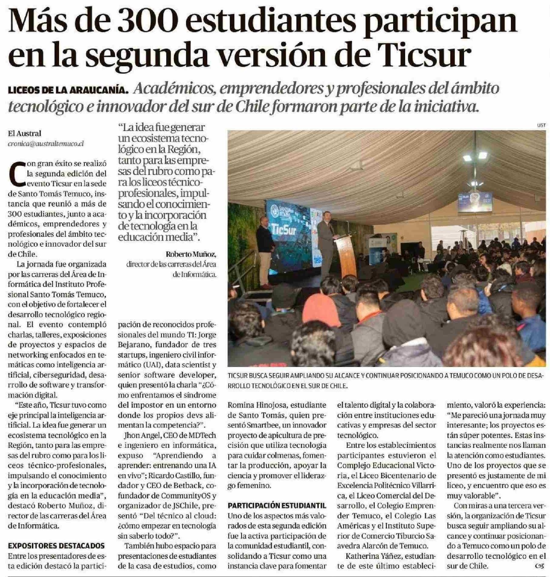 Más de 300 estudiantes participan en la segunda versión de Ticsur 08-06-2025 El Austral de la Araucanía |