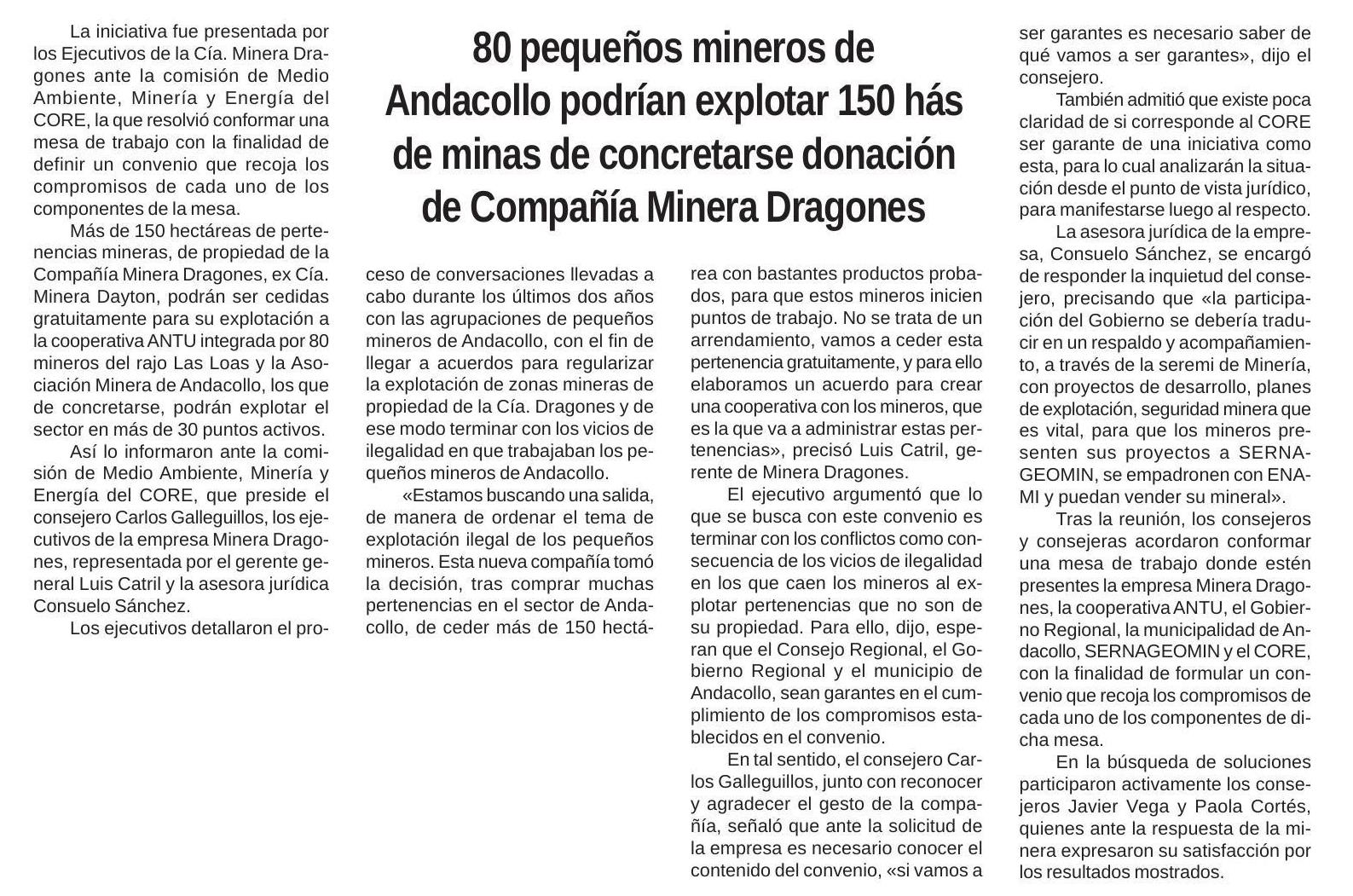 Título: 80 pequeños mineros de Andacollo podrían explotar 150 hás de minas de concretarse donación de Compañía Minera Dragones