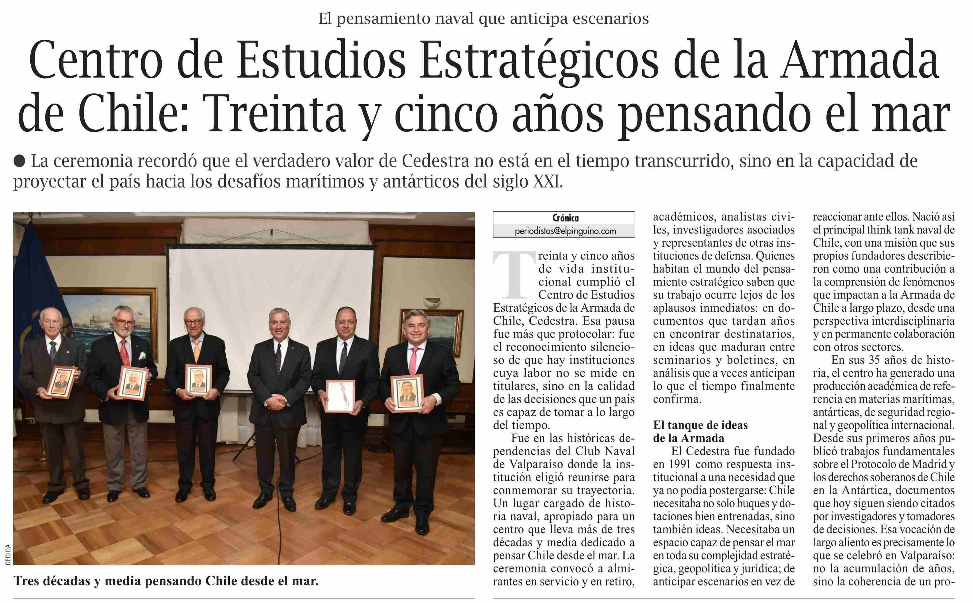 Centro de Estudios Estratégicos de la Armada de Chile: Treinta y cinco años pensando el mar 28-04-2026 El Pingüino |