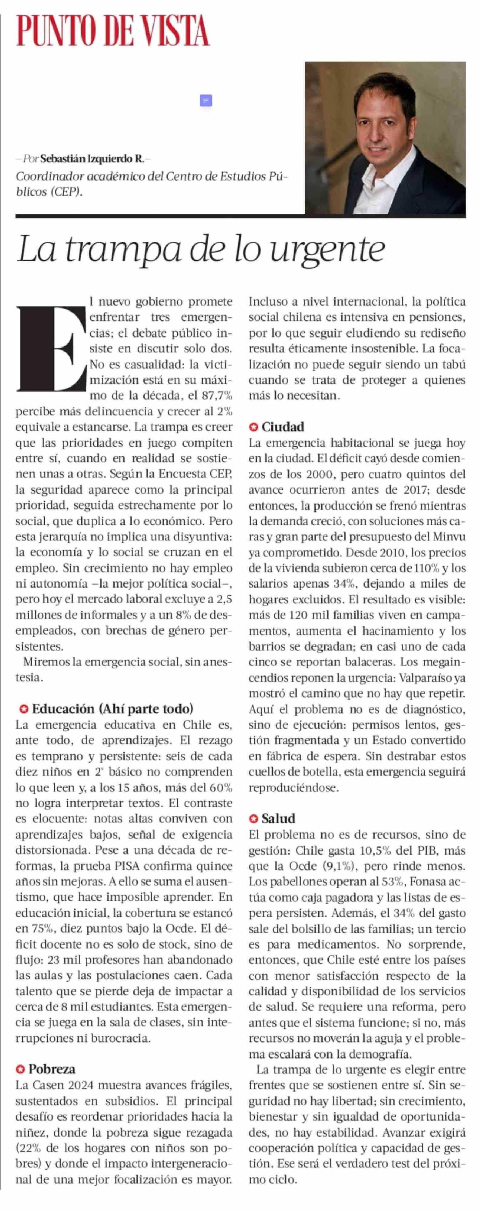 Columnas de Opinión: La trampa de lo urgente 14-02-2026 La Tercera |