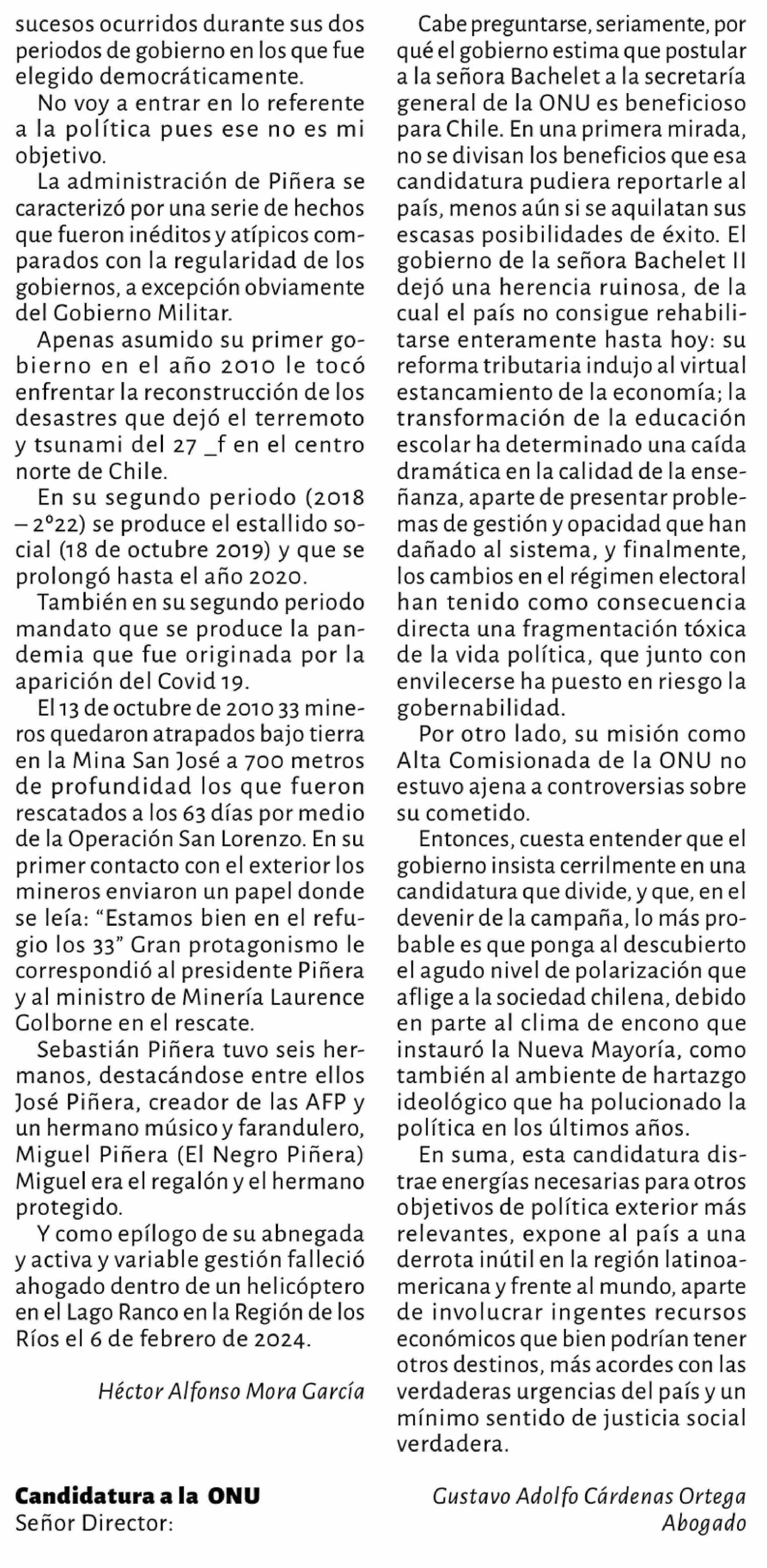 Título: Columnas de Opinión: Candidatura a la ONU Señor Director: