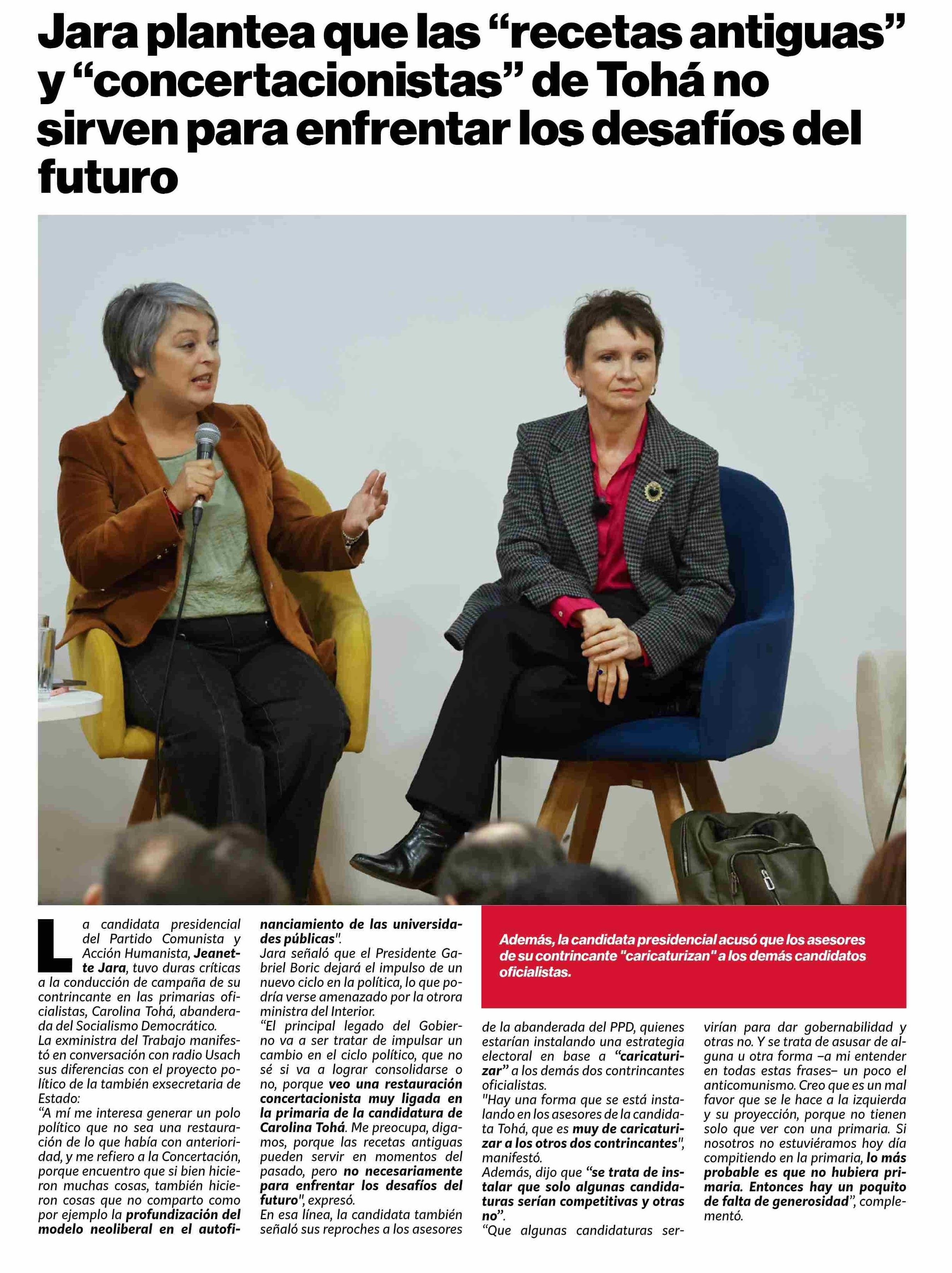 | Título: | Jara plantea que las “recetas antiguas” y “concertacionistas” de Tohá no sirven para enfrentar los desafíos del futuro |