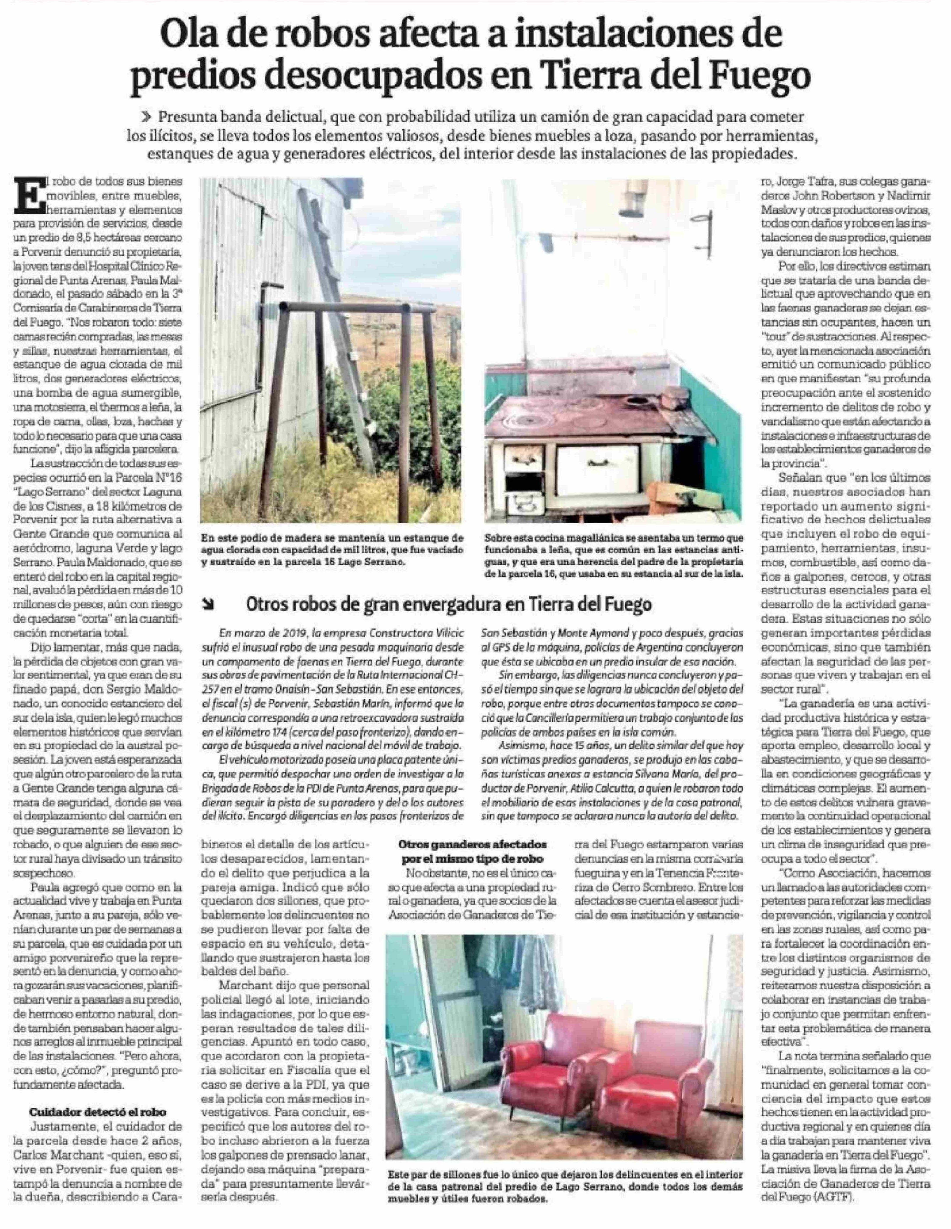 Título: Ola de robos afecta a instalaciones de predios desocupados en Tierra del Fuego