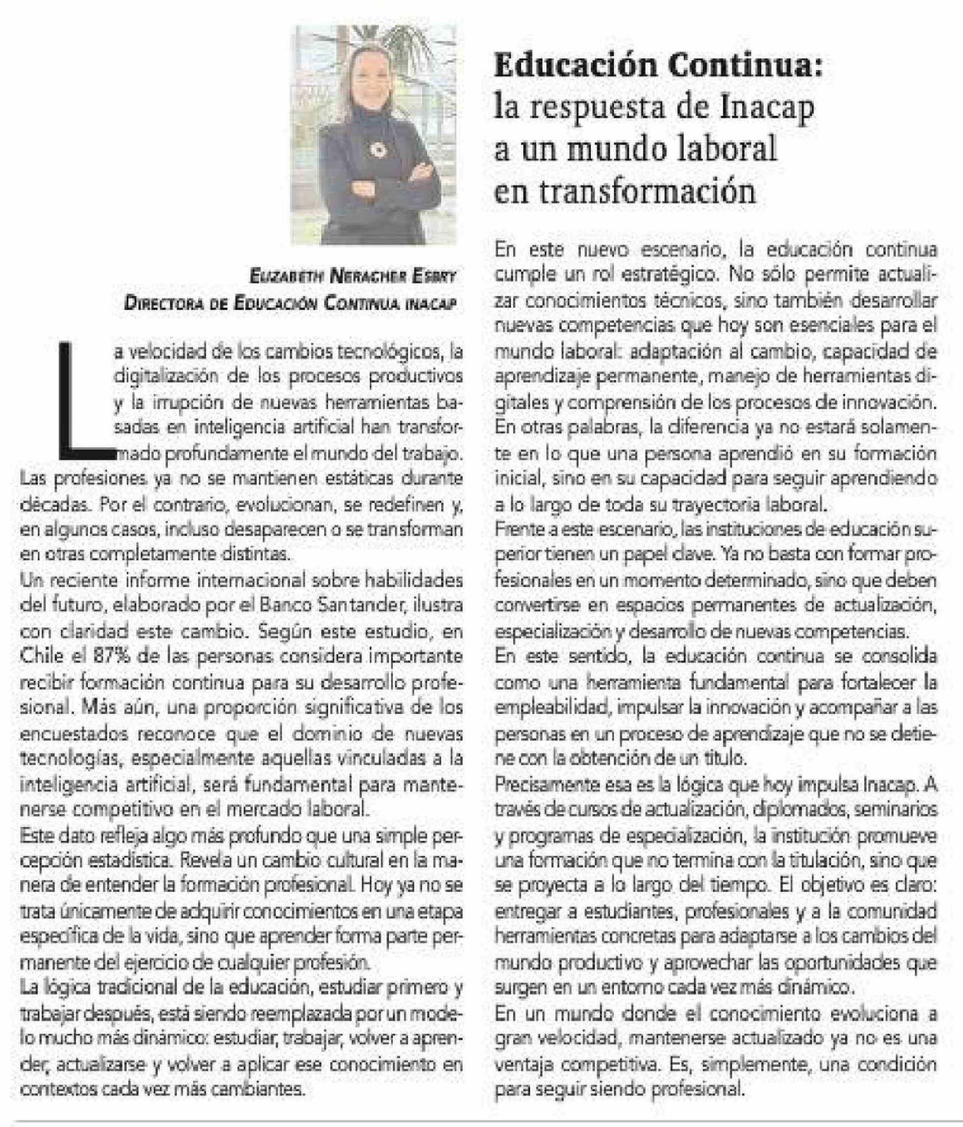 Título: Columnas de Opinión: Educación Continua: la respuesta de Inacap a un mundo laboral en transformación