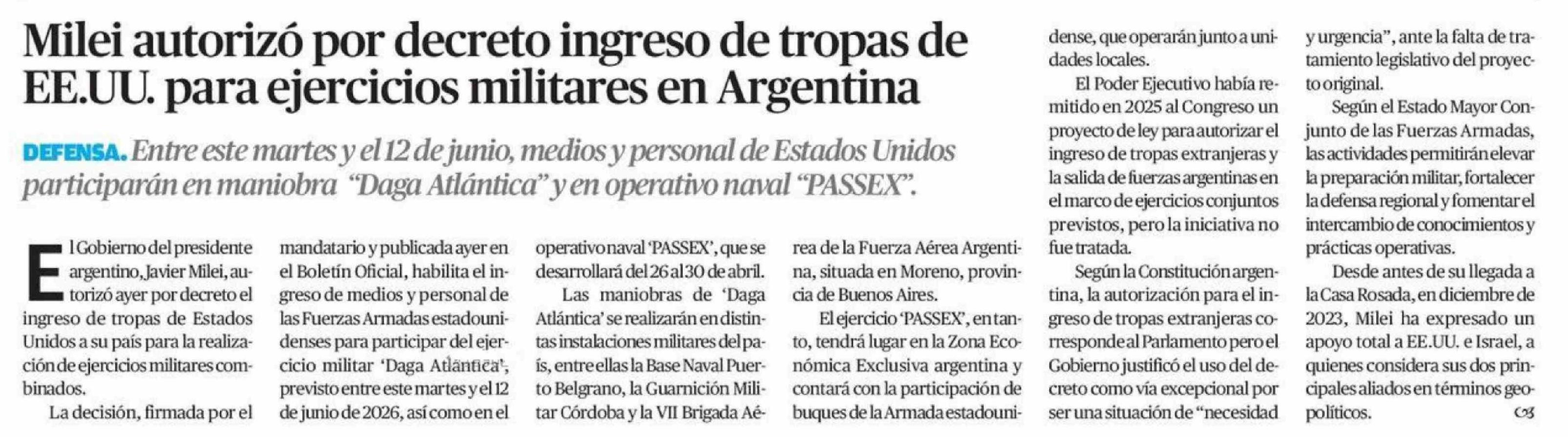 | Título: | Milei autorizó por decreto ingreso de tropas de EE.UU. para ejercicios militares en Argentina |