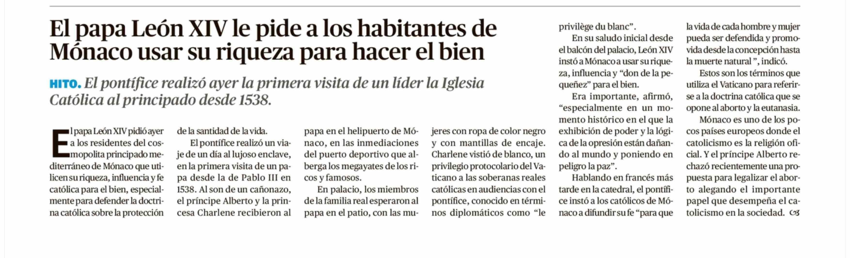 | Título: | El papa León XIV le pide a los habitantes de Mónaco usar su riqueza para hacer el bien |