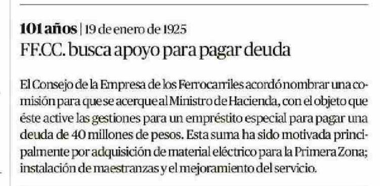 | Título: | 101 años | 19 de enero de 1925 FF.CC. busca apoyo para pagar deuda El Consejo de la Empresa de los Ferrocarriles acordó nombrar una comisión para que se acerque al Ministro de Hacienda, con el objeto que éste active las gestiones para un empréstito especial para pagar una deuda de 40 millones de pes |