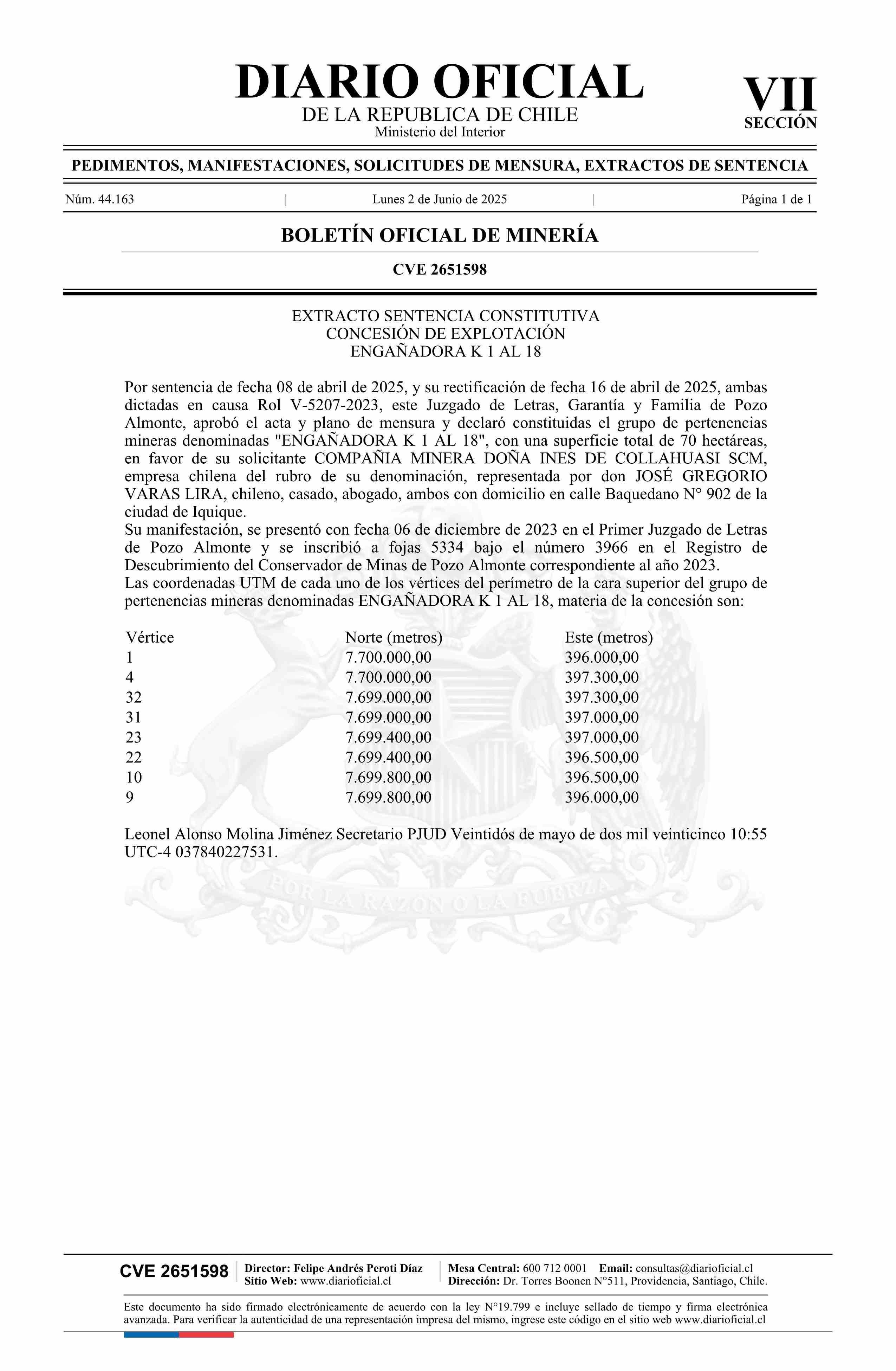 ENGAÑADORA K 1 AL 18 / Compañía Minera Doña Inés de Collahuasi SCM 02-06-2025 DIARIO OFICIAL CHILE - BOLETÍN OFICIAL DE MINERÍA |