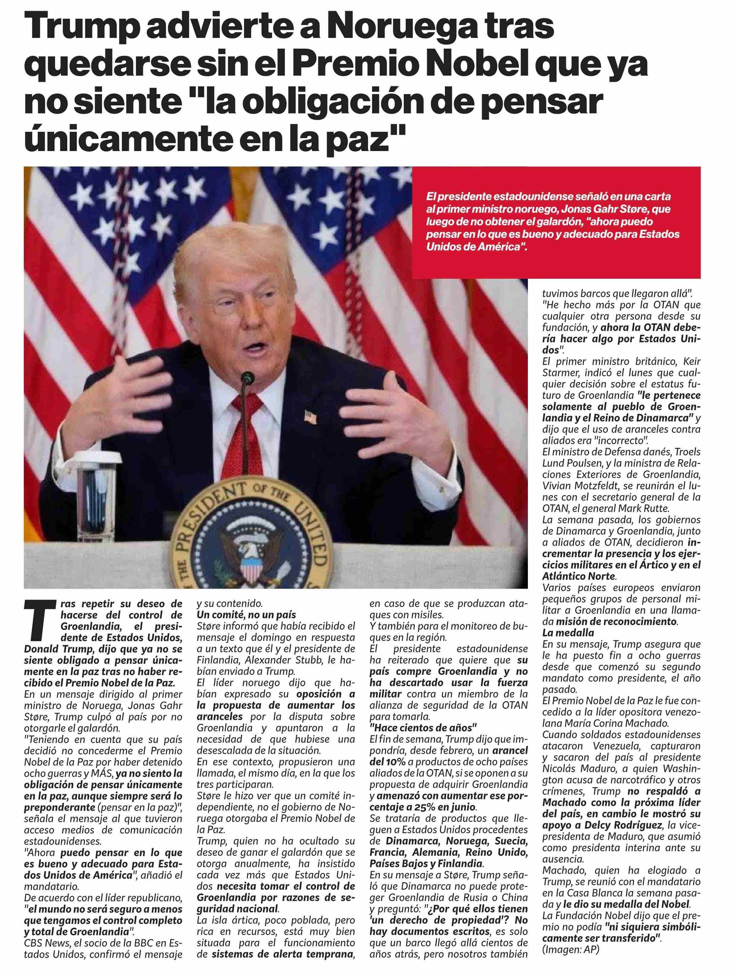 Trump advierte a Noruega tras quedarse sin el Premio Nobel que ya no siente "la obligación de pensar únicamente enla paz" 19-01-2026 Puranoticia.cl |